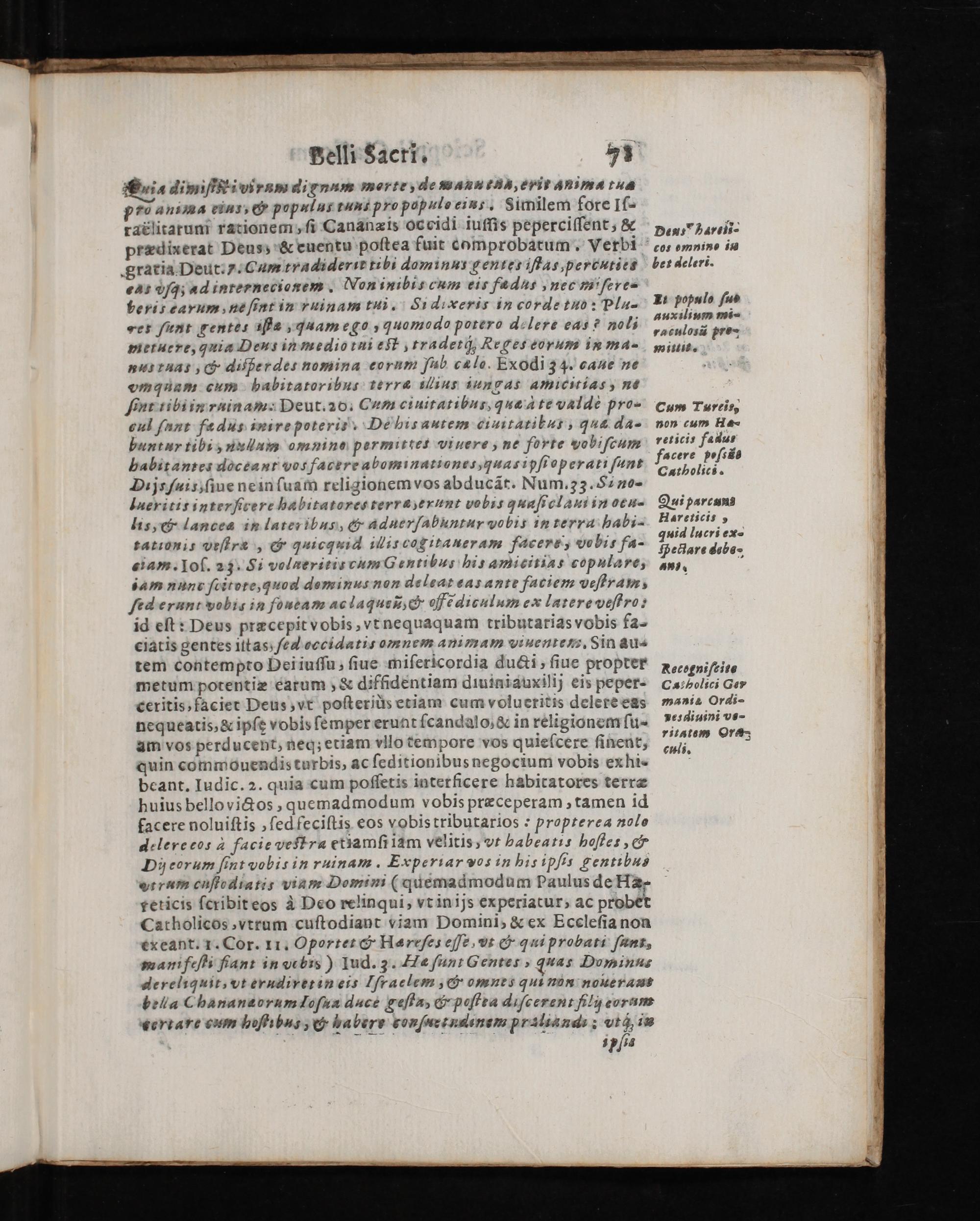 Via diwiſtii vrum dignam worre⸗ de mannrA, erit anima tu⸗ panMa eiun populus tun! pro populo eiur· Similem fore Iſ⸗ ratlitaruni rationem/ ſi Cananæ is oc cidi iuſſis peperciſſent,& prædinerat Deus& euentu poſtea fuit comprobarum. Verbi graria Deut.7. Gum tradiderit tibi dominus gentes Mapertuties e4 ad internecionem. Non inibis cum eis faduu nec mſere⸗ beri cxrum ne ſint in ruin am tui. Sdiveris in corde tuo: Plu⸗ „er ſunt gentes iſe Juamegouomodo potero delere eas? noli neruere, quis Deut in medio tui eft tradet qj Erges eorum in ma⸗ vub raa G. diiße rdes nomina eorum ſub calo Exodiz 4. calue ne vmMam cum habitatoribus terræ vlius iun gas amicitias n⸗ ſint ribi in ruin am Deut.⁊0. Cum ciuitatibut Juæ d te valde pro- cul ſunt ſedus ini re poteris De his autem ciuitatitun quæ da- huntar tibi nxlum omnino permittes viuers ne Forte vobiſcum habit ante doceant vonfacere abominationeuas ipſloperatiſunt Dajn ſuiſiue ne in ſuam religionem vos abducãt. Num.33. S no- lueritin interſie re hahitatores terraerunt vobis quaſiclaui in veu⸗ lis, G lancea in Inten ihu,& aduerſabuntur vobis in terra habi- tationi vrſtræ, G Juicuid ilin eogitaueram facers⸗ Vobir fa⸗ niam. Ioſ. 23 Fi volaeritis rum Gentibus his amicitias copulare⸗ iam nunt ſtitvte quod daminus non deloat va ante faciem veſtram⸗ ſad erunt vobin in fueam ac iaqusð̃ effẽditulum ex latere veſtro⸗ id eſt: Deus præcepit vobis vt nequaquam tributarias vobis fa- ciatis gentes iltas ſed oœcidati? omnnem animam vnuenten. Sin au- tem contempto Pei iuſſu ſiue miſericordia dudti/ ſiue propter metum potentiæ earum/& diffidentiam diuini auxilij eis peper- ceritis/ faciet Deus/ vt poſteriùs etiam cum volueritis delere eas nequeatis/& ipſe vobis ſemper erunt ſcandalo& in religionem ſu- am vos perduceht, neq; etiam vlo tempore vos quieſcere ſinent, quin commouendis turbis, ac ſeditionibus negocium vobis ex hi- beant. Iudic.⁊. quia cum poſſetis interficere habitatores terræ huius bellovidos, quemadmodum vobis præceperam/ tamen id facere noluiſtis/ ſed feciſtis eos vobis tributarios? propte rea nolo delere eos a facie veſra etiamſi iam velitis, vt habeati hoßen& Pyj eorum ſint vohi in ruinam. Evperiar vox in hi⸗ ipſi gentihu⸗ ↄtrum cuſtodia ti Viam Domini(quemadmodum Paulus de Har reticis ſcribit eos à Deo relinqui, vt in ijs experiatur, ac probet catholicosvtrum cuſtodiant viam Pomini,& ex Eccleſia non exeant. 1. Cor. 11. Oportet& Hareſen eſe vt& Jui probati ſunt. mannfeſi Fant in vc bꝛ) Iud. 3. Ie ſunt Gentes, Juas Dominus de relquit/ vt erudiret in eis Iſraelem G omnes qui nun noie raus bela C bananæorum doſux duce geſta⸗ c paſtr diſcerent lij eorum ertare vum haſtibu d babert Fonſurtndinsm praliand vtq; i8