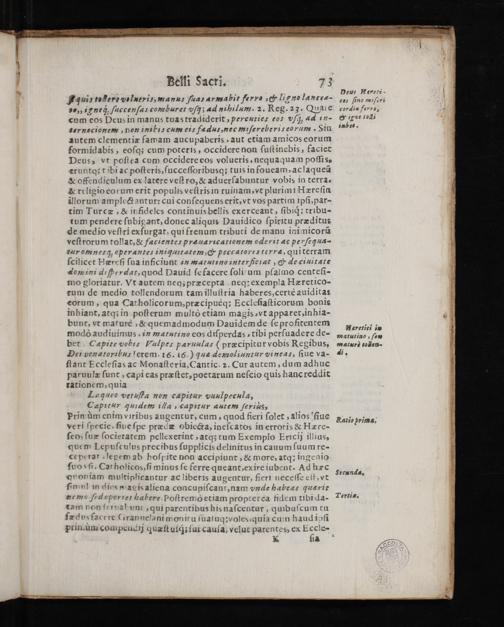 Vuin toMere volneris manu ſua armabit ſerro lig no lancra b„ i ne; uccenſa comburet vſʒ d nihilum. 2. Reg. 23. Qaie cum eos Peus in manus tuas tradiderityereuties eos ſhjᷓ; ad 1n hernecionem non inili cum ei fædutnec miſerebe ri? eorum SIn autem clementiæ famam aucupaberisaut etiam amicos eorum formidabis, eoſq; cum poteris, occidere non ſuſtinebis faciet Deus, vt poſtea cum occidere eos volueris nequaquam poſſis? eruntqʒ t ibi ac poſteris, ſucceſſoribusq; tuis in foueamac laqueũ & offendicuſum ex latere vᷣeſt ro,& aduerſabuntur vobis in terra⸗ & religio eorum erit populis veſtris in ruinam vt plurim Hæreſin illorum amplect antur: cui conſequens erit, vt vos partim ipſipar- tim Turcæ,& in fidelcs continuis bellis exerceant, ſibiq; tribu- tum pendere ſubigant, donec aliqus Dauidico ſpiritu præditus de medio veſtri exfurgat qui frenum tributi de manu inimicorũ veſtrorum tollat,& facienten ꝑ raua ricationem ode rit ac pe xſeqJua- VAr omnerh operante⸗ iniutatemG peccatore⸗ terræ, qui terram ſcilicet Hæreſi ſua inficiunt in matutino interfcꝛat,& de ciuitate dom ini di ſerdat, quod Dauid ſefacere ſoli um pſalmo centeſi- mo gloriatur. Vt autem neq; præcepta neq; exempla Hæretico- rum de medio tollendorum tam illuſtria haberes, certè auiditas rorum, qua Catholicorum⸗præcipueq; Eccleſiaſticorum bonis inhiant, atq; in poſterum multò etiam magis⸗vt apparet, inhia- bunt, vt maturè& quemadmodum Dauidemde ſeprofitentem modò audiuimus in matutino eos diſperdas tibi perſuadere de- bet Capite vobun Vulpes paruulas(præcipitur vobis Regibus, Den venatoribus letem. 16. 16.) Ju2 demoliuntur vineas ſiue va- ſtant Fccleſias ac Monaſteria, Cantic. ⁊. Cur autem, dum adhuc paruulæ ſunt, capi eas præſtet poetarum neſcio quis hanc reddit rationem, quia Laueo vetuſta non capitur vuulpecula, Capꝛtur Jundem 1lla/ capitur autem ſerius,