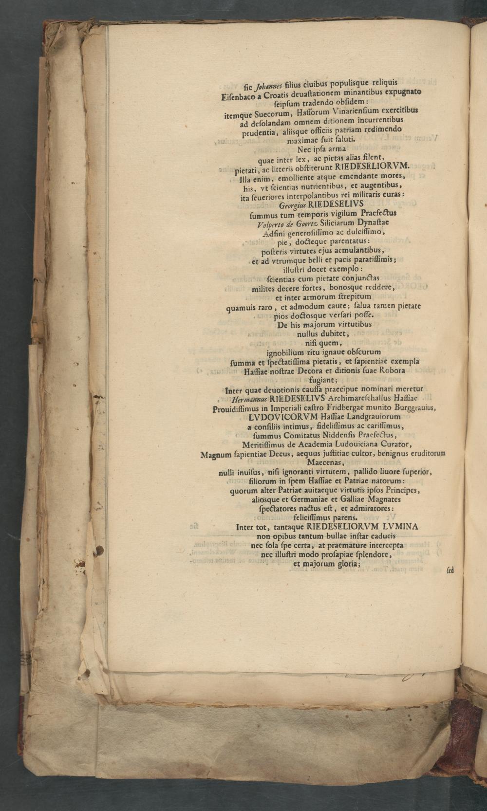 ſie Johunnes ſlius ciuibus populisque reliquis Fiſenbaco a Croatis deuaſtationem minantibus expugnato ſeipſum tradendo obſidem: itemque Suecorum, Haſſorum Vinarienfium exercitibus ad deſolandam omnem ditionem incurrentibus prudentia, aliisque officiis patriam redimendo maximae fuit ſaluti. Nec ipſa arma quae inter lex, ac pietas alias ſilent, pietati, ac litteris obſtiterunt KIFDFSKLIORKVM. Illa enim, emolliente atque emendante mores, pis, vt ſcientias nutrientibus, et augentibus, ita ſeueriores interpolantibus rei militaris curas: rgiu RIEDHSFLIVS ſummus tum temporis vigilum Praefectus Volperto de Goertæ Siliciarum Dynaſtae Adfini generoſitimo ac dulcifſimo, pie, doctequc parentatus: poſteris virtutes e jus aemulantibus, et ad vtrumque belli et pacis paratiſſimis; illuſtri docet exemplo: ſcientias cum pietate conjunctas milites decere fortes, bonosque reddere, et inter armorum ſtrepitum quamuis raro, et admodum caute: ſalua tamen pietate pios doctosque verſari poſſe. De his majorum virtutibus nullus dubitet, niſi quem, ignobilium ritu ignaue obſcurum ſumma et ſpectatifſima pietatis, et ſapientie exempla Haſſiae noſtrae Decora et ditionis ſuae Robora fugiant; inter quae deuotionis cauſſa praecipue nominari meretur Permannus RIEDKSFLIVS Archimareſchallus Haffiae prouidifſimus in Imperiali caſtro Fridbergae munito Burggrauius, LVDOVICORKVM Haffiae Landgrauiorum a conſiliis intimus, fideliſſimus ac cariſſimus, ſummus Comitatus Niddenſis Praefectus, Meritiffimus de Academia Ludouiciana Curator, Magnum ſapientiae Decus, acquus juſtitiae cultor, benignus eruditorum Maecenas, nulli inuiſus, niſi ignoranti virtutem, pallido liuore ſuperior, filiorum in ſpem Haſſiae et Patriae natorum: quorum alter Patriae auitaeque virtutis ipſos Principes, aliosque et Germaniae et Galliae Magnates ſpectatores nactus eſt, et admiratores: ttteliciflimus parens. Inter tot, tantaque KIHDHSFLIOKVM LVMINA non opibus tantum bullae inſtar caducis nec ſola ſpe certa, at praemature intercepta nec illuſtri modo proſapiae ſplendore, et majorum gloria;