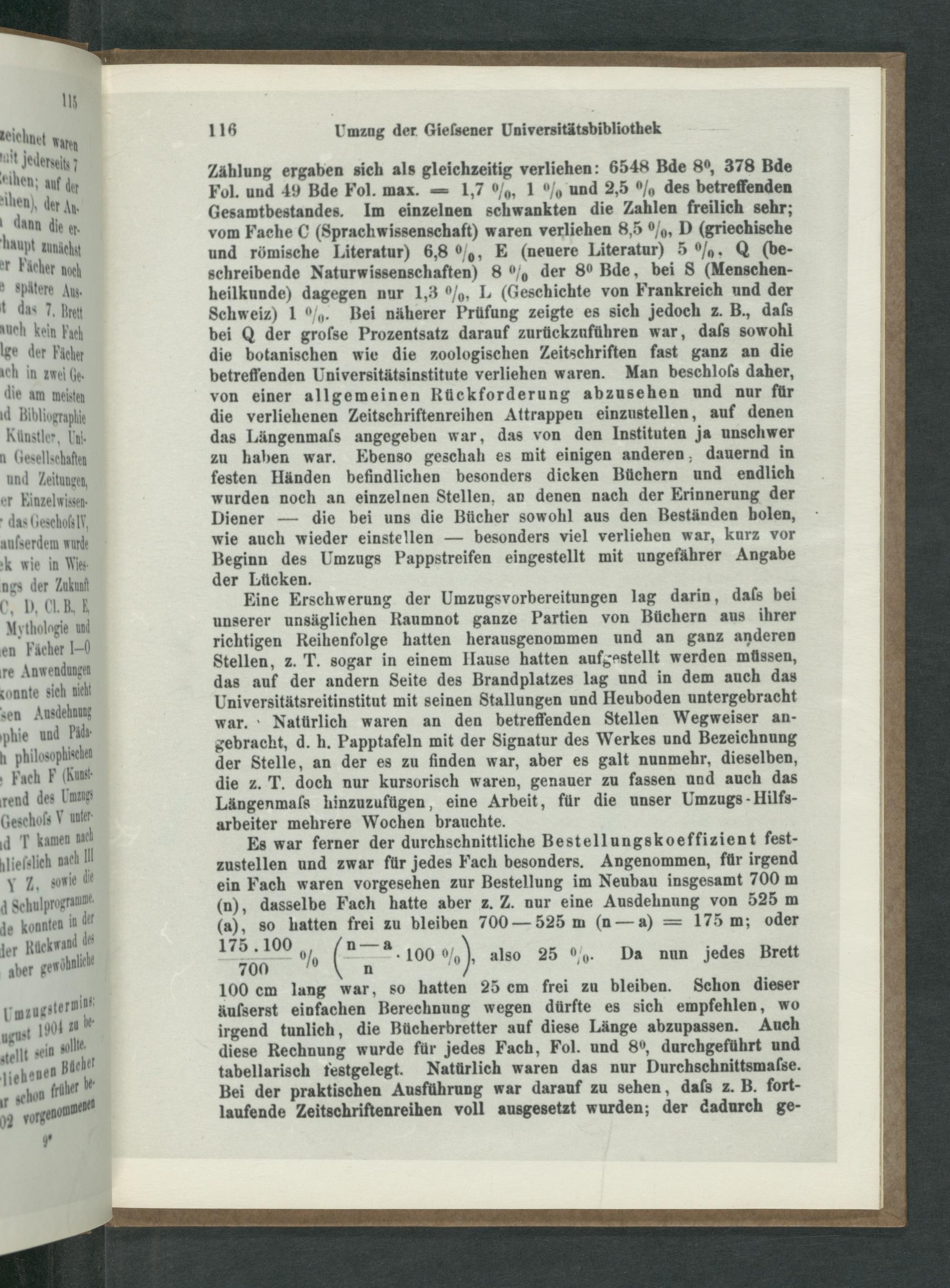 Zählung ergaben sich als gleichzeitig verliehen: 6548 Bde 8⁰°, 378 Bde Fol. und 49 Bde Fol. max.— 1,7%, 1% und 2,5% des betreffenden Gesamtbestandes. Im einzelnen schwankten die Zahlen freilich sehr; vom Fache C(Sprachwissenschaft) waren verliehen 8,5%, D(griechische und römische Literatur) 6,8%, E(neuere Literatur) 5%. Q(be- schreibende Naturwissenschaften) 8% der 8⁰ Bde, bei S(Menschen- heilkunde) dagegen nur 1,3%, L(Geschichte von Frankreich und der Schweiz) 1%. Bei näherer Prüfung zeigte es sich jedoch z. B., daſs bei Q der groſse Prozentsatz darauf zurückzuführen war, daſs sowohl die botanischen wie die zoologischen Zeitschriften fast ganz an die betreffenden Universitätsinstitute verliehen waren. Man beschloſs daher, von einer allgemeinen Rückforderung abzusehen und nur für die verliehenen Zeitschriftenreihen Attrappen einzustellen, auf denen das Längenmafs angegeben war, das von den Instituten ja unschwer zu haben war. Ebenso geschah es mit einigen anderen, dauernd in festen Händen befindlichen besonders dicken Büchern und endlich wurden noch an einzelnen Stellen, an denen nach der Erinnerung der Diener— die bei uns die Bücher sowohl aus den Beständen bolen, wie auch wieder einstellen— besonders viel verliehen war, kurz vor Beginn des Umzugs Pappstreifen eingestellt mit ungefährer Angabe der Lücken.