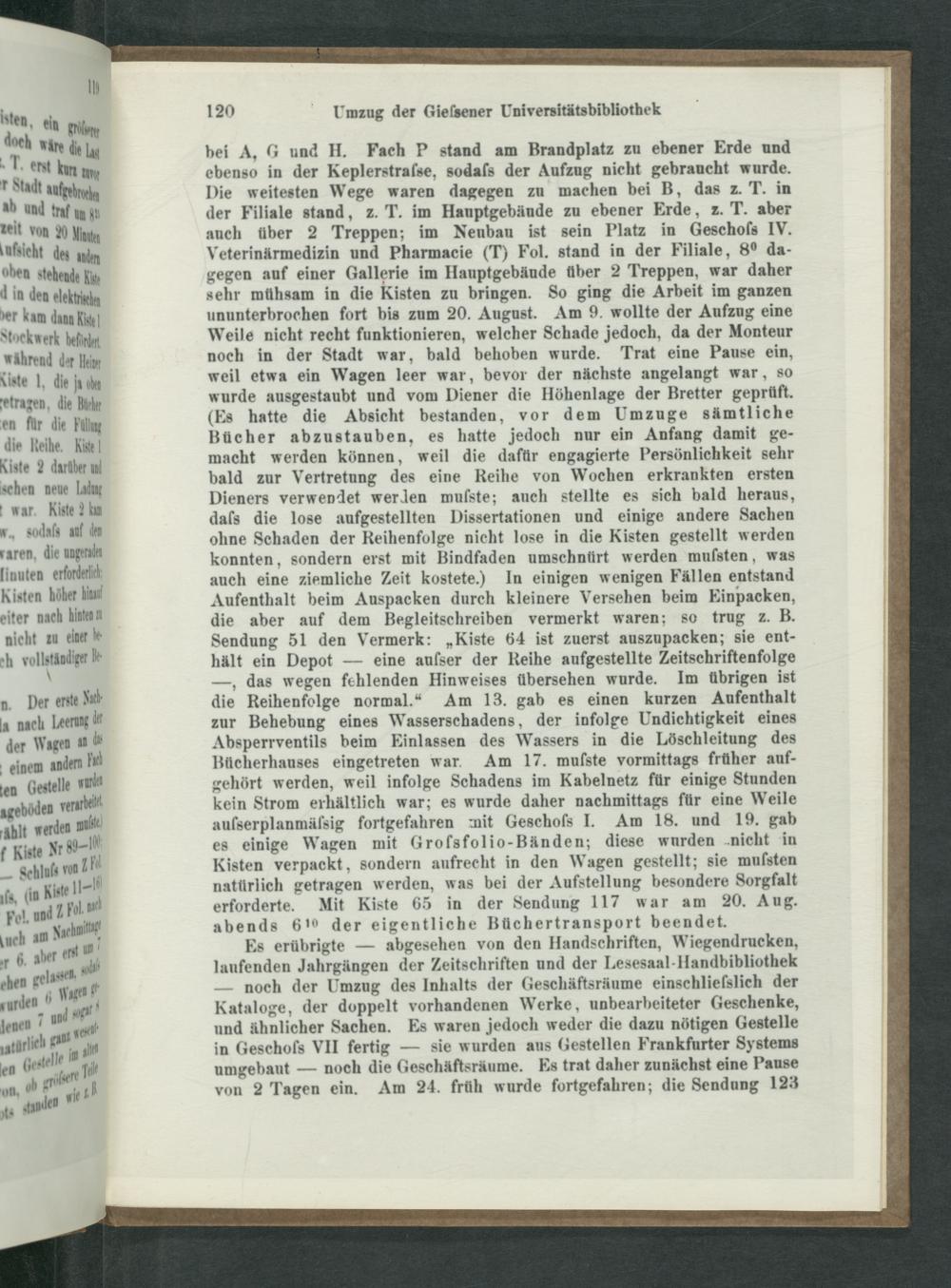 bei A. G und H. Fach P stand am Brandplatz zu ebener Erde und ebenso in der Keplerstrafse, sodaſs der Aufzug nicht gebraucht wurde. Die weitesten Wege waren dagegen zu machen bei B, das z. T. in der Filiale stand, z. T. im Hauptgebäude zu ebener Erde, z. T. aber auch über 2 Treppen; im Neubau ist sein Platz in Geschofs IV. Veterinärmedizin und Pharmacie(T) Fol. stand in der Filiale, 8⁰ da- gegen auf einer Gallerie im Hauptgebäude über 2 Treppen, war daher sehr mühsam in die Kisten zu bringen. So ging die Arbeit im ganzen ununterbrochen fort bis zum 20. August. Am 9. wollte der Aufzug eine Weile nicht recht funktionieren, welcher Schade jedoch, da der Monteur noch in der Stadt war, bald behoben wurde. Trat eine Pause ein, weil etwa ein Wagen leer war, bevor der nächste angelangt war, so wurde ausgestaubt und vom Diener die Höhenlage der Bretter geprüft. (Es hatte die Absicht bestanden, vor dem Umzuge sämtliche Bücher abzustauben, es hatte jedoch nur ein Anfang damit ge- macht werden können, weil die dafür engagierte Persönlichkeit sehr bald zur Vertretung des eine Reihe von Wochen erkrankten ersten Dieners verwendet werlen muſste; auch stellte es sich bald heraus, daſs die lose aufgestellten Dissertationen und einige andere Sachen ohne Schaden der Reihenfolge nicht lose in die Kisten gestellt werden konnten, sondern erst mit Bindfaden umschnürt werden muſsten, was auch eine ziemliche Zeit kostete.) In einigen wenigen Fällen entstand Aufenthalt beim Auspacken durch kleinere Versehen beim Einpacken, die aber auf dem Begleitschreiben vermerkt waren; so trug z. B. Sendung 51 den Vermerk:„Kiste 64 ist zuerst auszupacken; sie ent- hält ein Depot— eine aufser der Reihe aufgestellte Zeitschriftenfolge —, das wegen fehlenden Hinweises übersehen wurde. Im übrigen ist die Reihenfolge normal.“ Am 13. gab es einen kurzen Aufenthalt zur Behebung eines Wasserschadens, der infolge Undichtigkeit eines Absperrventils beim Einlassen des Wassers in die Löschleitung des Bücherhauses eingetreten war. Am 17. muſste vormittags früher auf- gehört werden, weil infolge Schadens im Kabelnetz für einige Stunden kein Strom erhältlich war; es wurde daher nachmittags für eine Weile aufserplanmäſsig fortgefahren mit Geschoſs I. Am 18. und 19. gab es einige Wagen mit Groſsfolio-Bänden; diese wurden nicht in Kisten verpackt, sondern aufrecht in den Wagen gestellt; sie muſsten natürlich getragen werden, was bei der Aufstellung besondere Sorgfalt erforderte. Mit Kiste 65 in der Sendung 117 war am 20. Aug. abends 6 der eigentliche Büchertransport beendet.