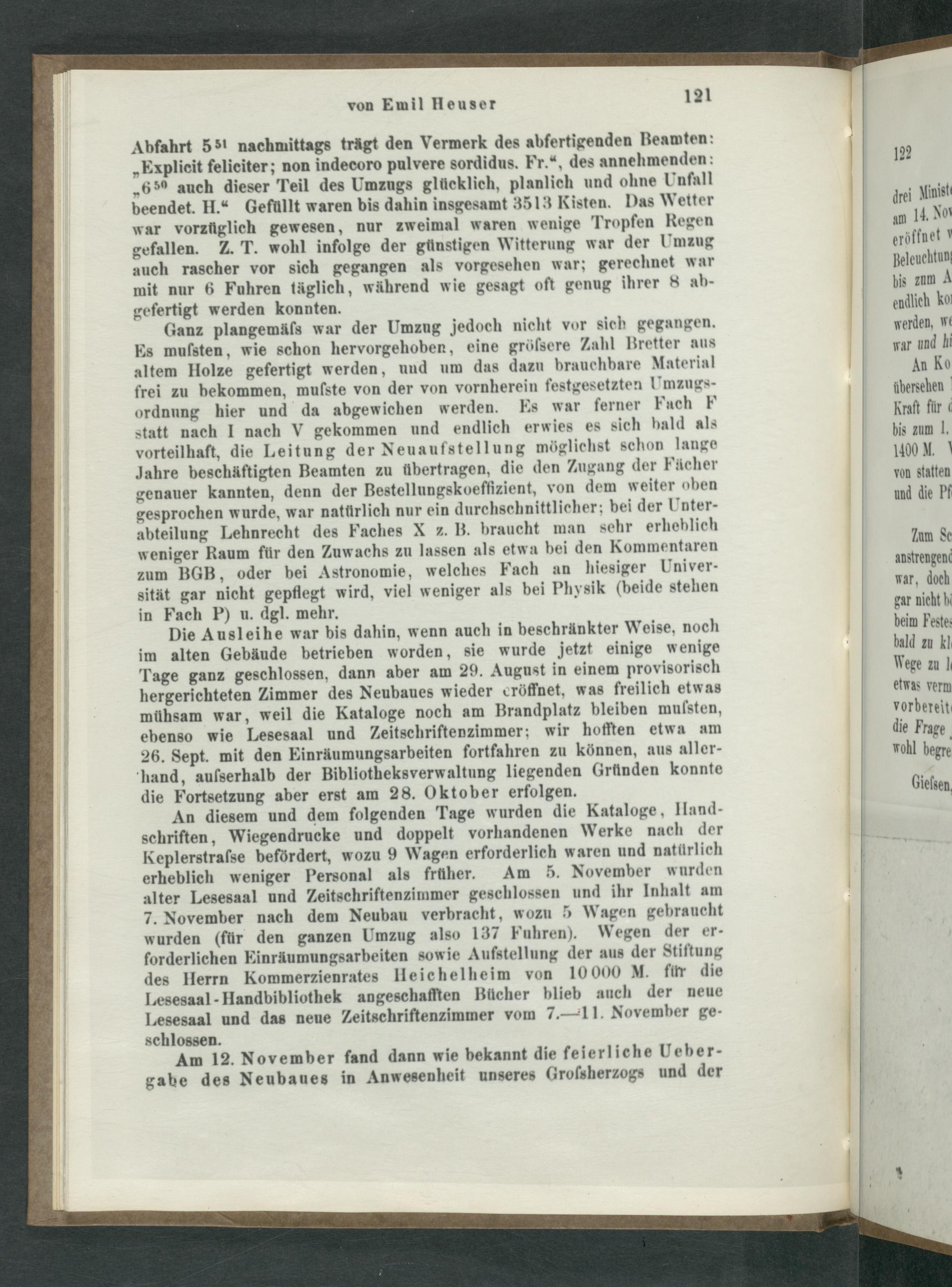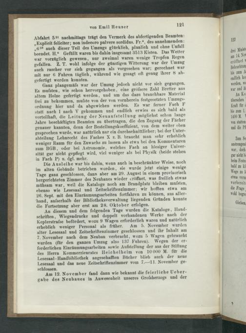 Die Ausleihe war bis dahin, wenn auch in beschränkter Weise, noch im alten Gebäude betrieben worden, sie wurde jetzt einige wenige Tage ganz geschlossen, dann aber am 29. August in einem provisorisch hergerichteten Zimmer des Neubaues wieder ceröffnet, was freilich etwas mühsam war, weil die Kataloge noch am Brandplatz bleiben muſsten, ebenso wie Lesesaal und Zeitschriftenzimmer; wir hofften etwa am 26. Sept. mit den Einräumungsarbeiten fortfahren zu können, aus aller- hand, aufserhalb der Bibliotheksverwaltung liegenden Gründen konnte die Fortsetzung aber erst am 28. Oktober erfolgen.