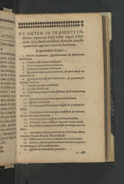 1. Varias notationes, ſignißtations e deſini ione Nobilitatis 2. Cauſam effrientem nobilitatis. 3. Cauſam marerialem nobilitatis. 4. Ccauſam ſprmalsm vobilitatis. Quomodo tacits quis nobilitetur,& Auanaw ſit ra cita nob ilit a. 6. Quomodo expreſ quis nobilitetur. eh quanam ſit⸗ oxpreſſa nobilitas. Cauſam Fnalem nobilitari. 8. Gradus Nohilitati. Nobi ium prarogativam ſeſionem epracedentiam inter ſoſe. 10. Signa epra ſumptiones maſoris nobilitati. 11. Ehedu nobilitatis. 12. Privilagis nobilitatis qua tonſiſtit in praſumßris- nibhus. 13. Privilgin nobilitatis que conßſtunt in reveren- vra(h honoribus dofersndis. 14. Privilegia qud conſiſtunt in immunitatibus. 1. Priwilegis qus conſiſtunt in pœnis temterandis. 16. Mſtelum quadampratermiſſa privilegia pertra- ans. 17. Iura ehprivilegis partitularia Nobilium libero- vum,der freien Reichs Ritterſchafft. 18. Adiones pro Nobilitate tuenda eh conſervanda. 19. AMiones ſeſionis chpracedentia nomne coanpeten- res earumq́; proceſſumjudiciarium · ⁊0. Quibus modis nobilitaprobetur. “ 21.Af-