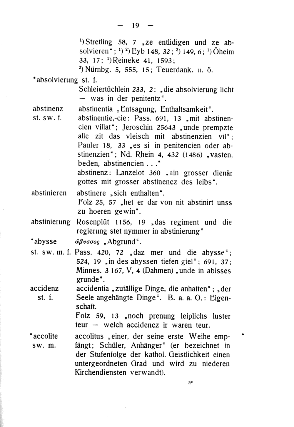 abstinentia„Entsagung, Enthaltsamkeit“. abstinentie,-cie: Pass. 601, 13„mit abstinen- cien villat“; Jeroschin 25643„unde prempzte alle zit das vleisch mit abstinenzien vil“; Pauler 18, 33„es si in penitencien oder ab- stinenzien“; Nd. Rhein 4, 432(1486)„Vasten, beden, abstinencien...“