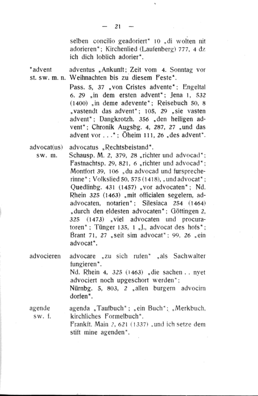 Pass. 5, 37„von Cristes advente“; Engeltal 6. 29„in dem ersten advent“; Jena 1, 532 (1400)„in deme adevente“; Reisebuch 50, 8 „vastendt das advent“; 105, 29„sie vasten advent“; Dangkrotzh. 356„den heiligen ad- vent“; Chronik Augsbg. 4, 287, 27„und das advent vor...“; Oheim 111, 26„des advent“.