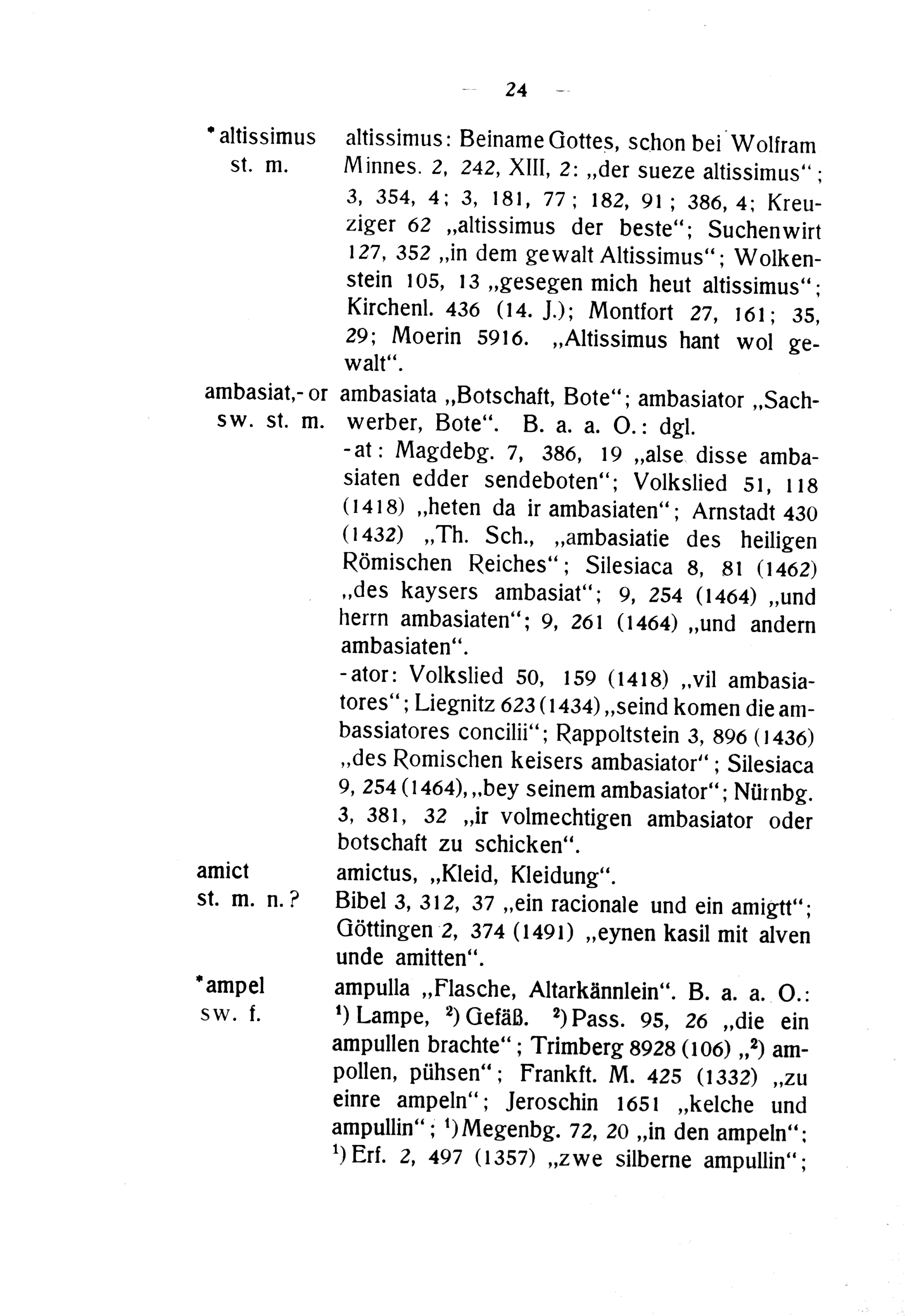 SW. st. m. werber, Bote“. B. a. a. O.: dgl. -at: Magdebg. 7, 386, 19„alse disse amba- siaten edder sendeboten“; Volkslied 51, 118 (1418)„heten da ir ambasiaten“; Arnstadt 430 (1432)„Th. Sch.,„ambasjatie des heiligen Römischen Reiches“; Silesiaca 8, 81(1462) „des kaysers ambasiat“;, 9, 254(1464)„und nerrn ambasiaten“; 9, 261(1464)„und andern ambasiaten“. ator: Volkslied 50, 150(1418)„vil ambasia- tores“; Liegnitz 623(1434)„Seind komen die am- bassiatores concilii“; Rappoltstein 3, 896(1436) „des Romischen keisers ambasiator“; Silesiaca 9, 254(1464),„bey seinem ambasiator“; Nürnbg. 3, 381, 32„ir volmechtigen ambasiator oder botschaft zu schicken“.