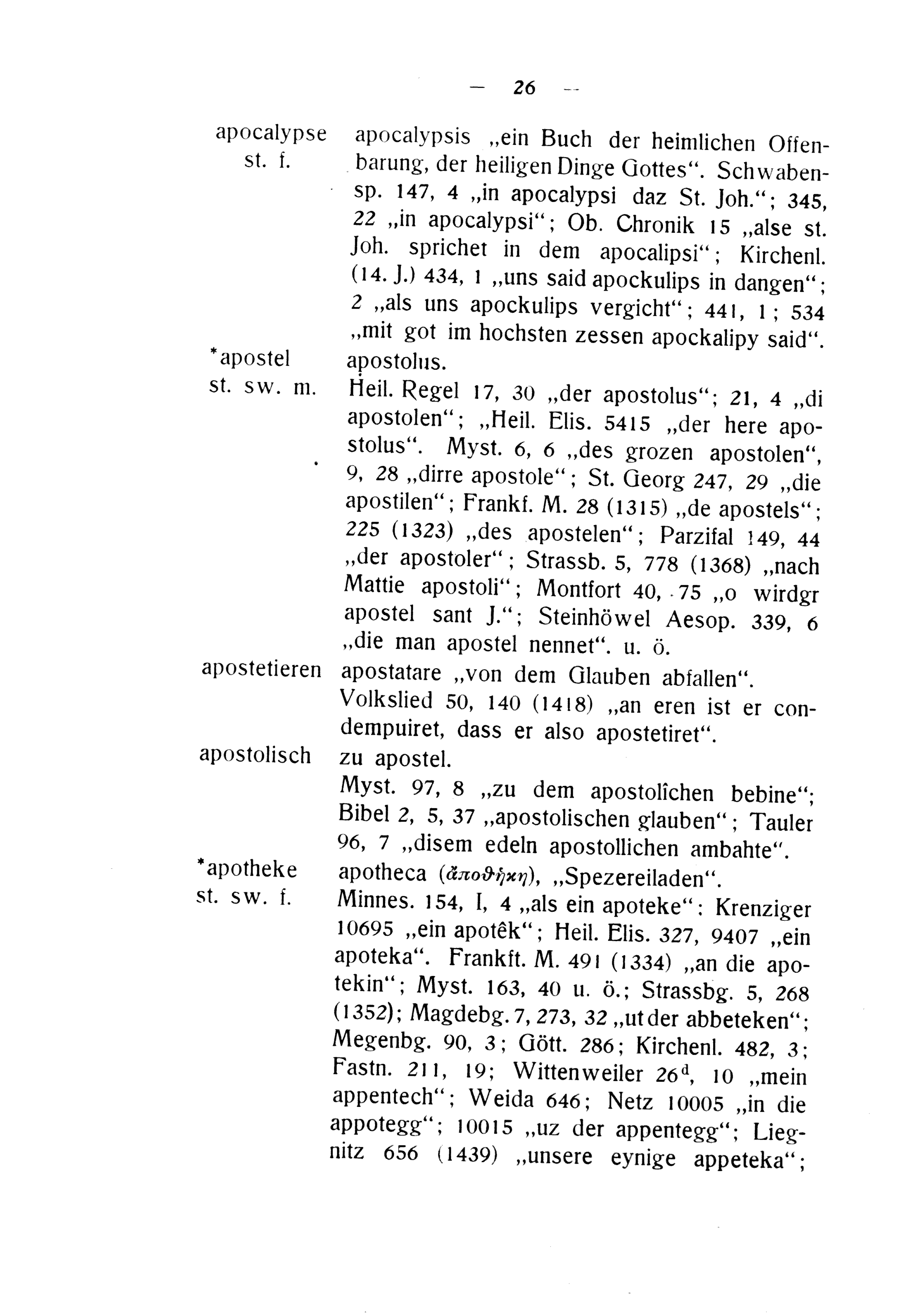Minnes. 184, I, 4„als ein apoteke“: Krenziger 10695„ein apoték“; Heil. Elis. 327, 9407„ein apoteka“. Frankft. M. 401(1334)„an die apo- tekin“; Myst. 163, 40 u. ö.; Strassbg. 5, 268 (1352); Magdebg. 7, 273, 32„ut der abbeteken“; Megenbg. 900, 3; Cött. 286; Kirchenl. 482, 3; Fastn. 211, 19; Wittenweiler 266, 10„mein appentech“; Weida 646; Netz 10008„in die appotegg“; 10015„uz der appentegg“; Lieg- nitz 656(1439)„unsere eynige appeteka“;