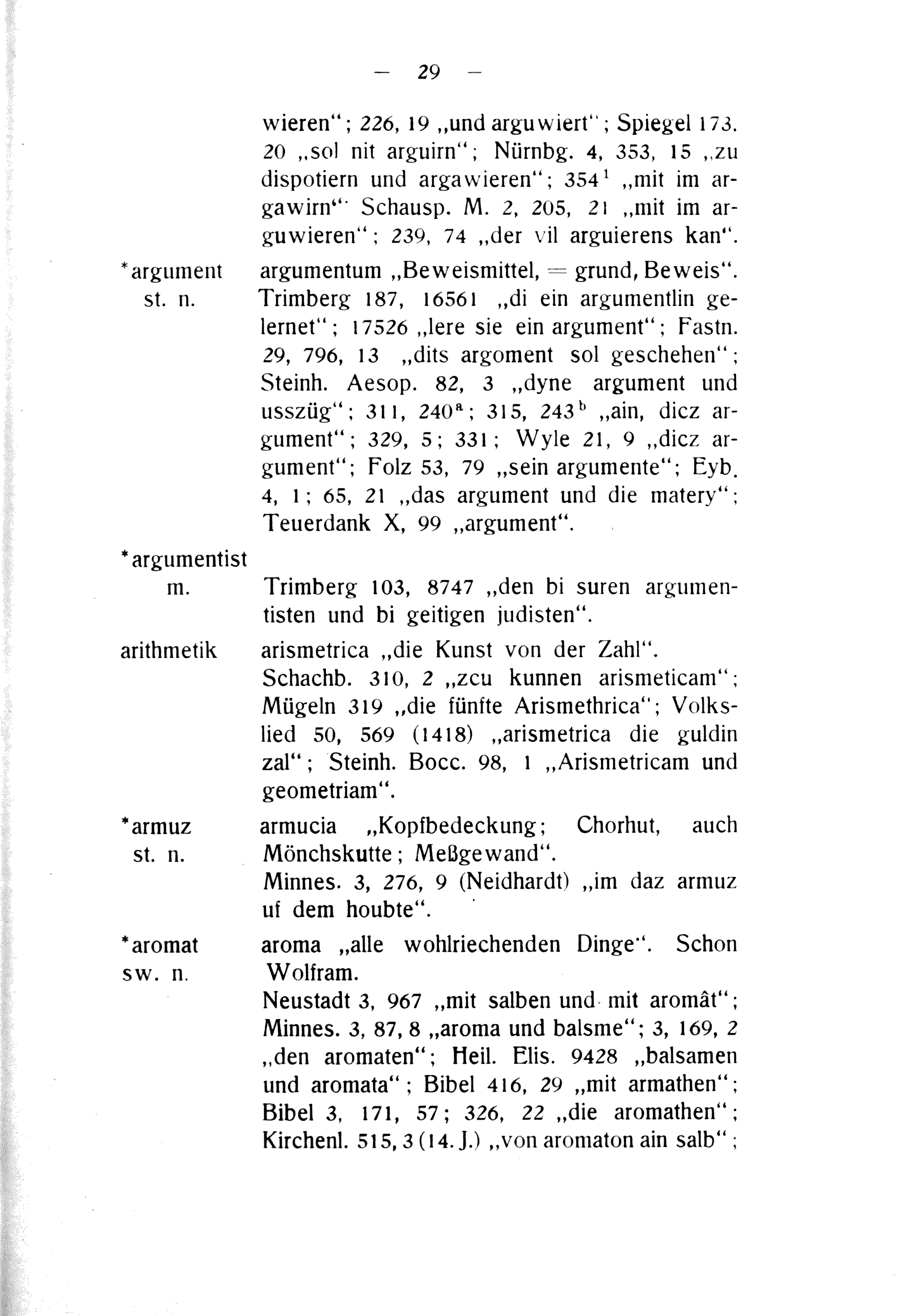 rargument argumentum„Beweismittel,= grund, Beweis“. st. n. Trimberg 187, 16561„di ein argumentlin ge- lernet“; 17526„lere sie ein argument“; Fastn. 29, 796, 13„dits argoment sol geschehen“: Steinn. Aesop. 82, 3„dyne argument und usszüg“; 311, 240*; 315, 243 5b„ain, dicz ar- gument“; 320, 5; 331; Wyle 21,°„dicz ar- gument“; Folz 53, 79„sein argumente“; Eyb. 4, 1; 65, 21„das argument und die matery“:; Teuerdank X, 90„argument“.