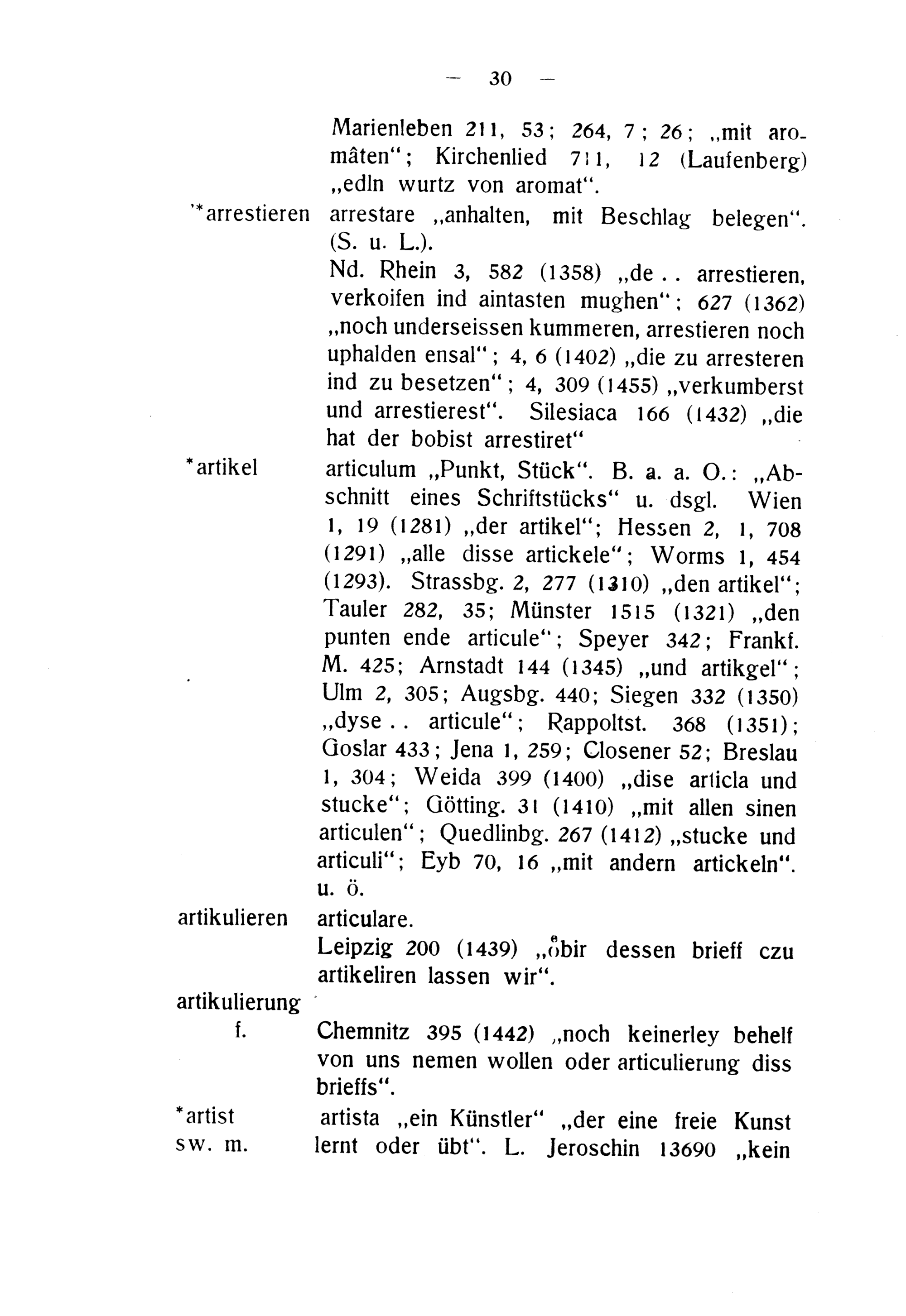 articulum„Punkt, Stück“. B. a. a. O.:„Ab- schnitt eines Schriftstücks“ u. dsgl. Wien 1, 19(1281)„der artikel“; Hessen 2, 1, 708 (1291)„alle disse artickele“; Worms 1, 454 (1293). Strassbg. 2, 277(1310)„den artikel“; Tauler 282, 35; Münster 1515(1321)„den punten ende articule“; Speyer 342; Frankf. M. 425; Arnstadt 144(1345)„und artikgel“; Ulm 2, 305; Augsbg. 440; Siegen 332(1350) „dyse.. articule“; Rappoltst. 368(1351); Goslar 433; Jena 1, 259; Closener 52; Breslau 1, 304; Weida 300(1400)„dise articla und stucke“; Götting. 31(1410)„mit allen sinen articulen“; Quedlinbg. 267(1412)„stucke und articuli“; Eyb 70, 16„mit andern artickeln“. u. ö.