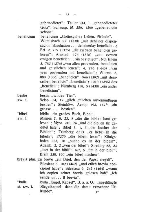 beneficium„Gottesgabe; Lehen, Pfründe“. Wittelsbach 300(1338)„mit dehainer dispen- sacion, absolucion..., deheinerlay beneficio..; Erf. 2, 750(1375)„die zu yren beneficien ge- horen“; Arnstadt 176(1376)„czu czwen ewigen beneficien.. sin bestetiget“; Nd. Rhein 3, 782(1376)„von allen provenden, beneficien und geistlichen lenen“; 4, 276(1446)„Van yren provenden ind beneficien“; Worms 2. 880(1386)„beneficien“; 966(1302)„mit dem- selben beneficio“„beneficia“; 1010(1305) des „beneficii“; Nürnberg 458, 5(1438)„ein ander beneficium“.