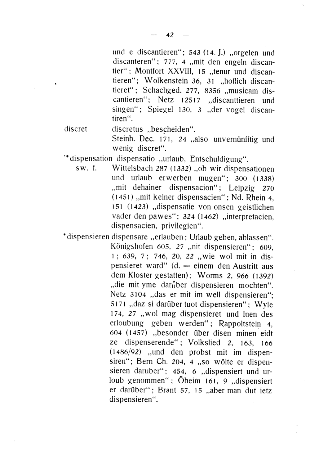Königshofen 605, 27„nit dispensieren“; 600, 1; 639, 7; 746, 20, 22„wie wol mit in dis-— pensieret ward“(d.= einem den Austritt aus dem Kloster gestatten); Worms 2, 966(1392) „die mit yme daruͤber dispensieren mochten“. Netz 3104„das er mit im well dispensieren“; 5171„daz si darüber tuot dispensieren“; Wyle 174, 27„wol mag dispensieret und Inen des erloubung geben werden“; Rappoltstein 4, 604(1457)„besonder über disen minen eidt ze dispenserende“; Volkslied 2, 163, 166 (1486/92)„und den probst mit im dispen— siren“; Bern Ch. 204, 4„So wölte er dispen-— sieren daruber“; 454, 6„dispensiert und ur— loub genommen“; Oheim 161, 0„dispensiert er darüber“; Brant 57, 15„aber man dut ietz dispensieren“.