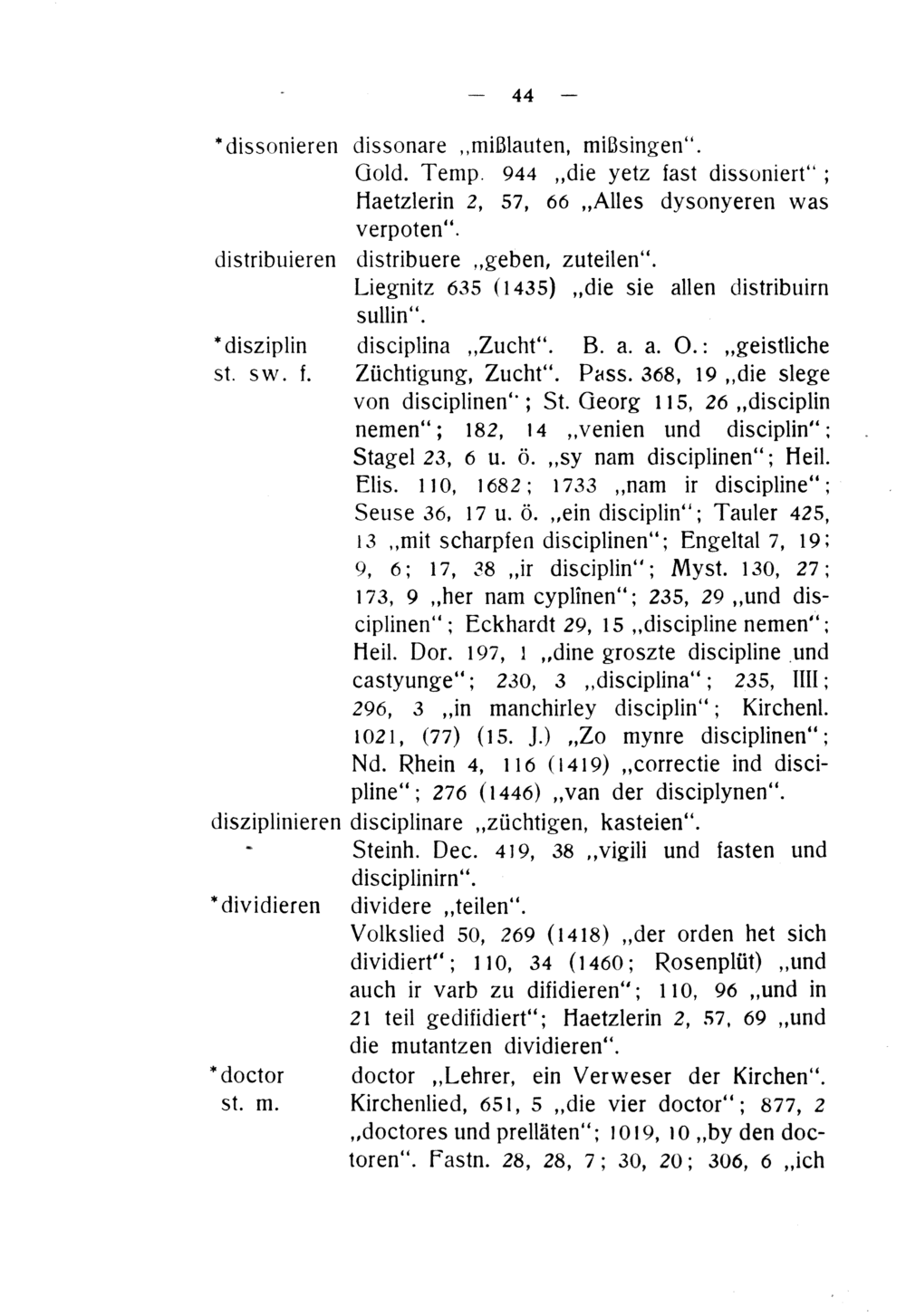 St. SW. f. Züchtigung, Zucht“. Pass. 368, 19„die slege von disciplinen“; St. Georg 115, 26„disciplin nemen“; 182, 14„venien und disciplin“: Stagel 23, 6 u. ö.„Sy nam disciplinen“; Heil. Flis. 110, 1682; 1733„nam ir discipline“; Seuse 36, 17 u. ö.„ein disciplin“; Tauler 425, 13„mit scharpfen disciplinen“; Engeltal 7, 19: 9, 6; 17, 38„ir disciplin“; Myst. 130, 27; 173, 92„her nam cyplinen“; 235, 29„und dis- ciplinen“; Eckhardt 29, 15„discipline nemen“: Heil. Dor. 197, 1„dine groszte discipline und castyunge“; 230, 3„disciplina“; 235, IIII; 296, 3„in manchirley disciplin“; Kirchenl. 1021,(77)(15. J.)„Zo mynre disciplinen“; Nd. Rhein 4, 116(1419)„Correctie ind disci- pline“; 276(1446)„van der disciplynen“.