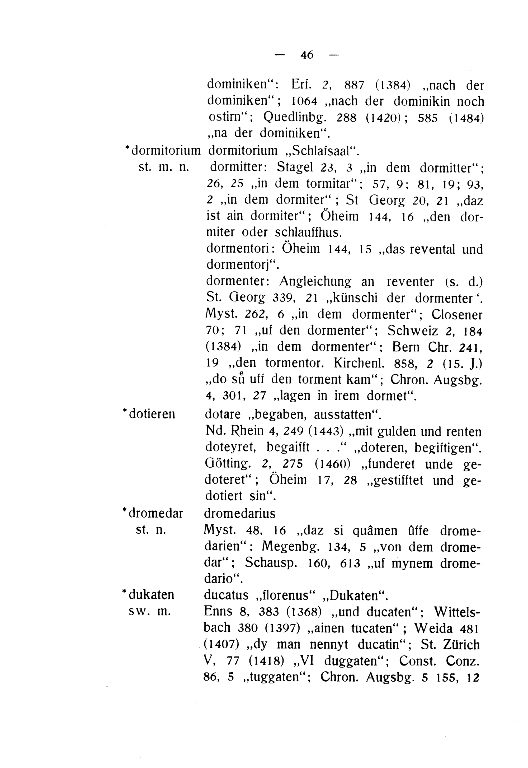 dormitter: Stagel 23, 3„in dem dormitter“; 26, 25„in dem tormitar“; 57, 9; 81, 19; 93, 2„in dem dormiter“; St Georg 20, 21„daz ist ain dormiter“; Oheim 144, 16„den dor-— miter oder schlauffhus.
