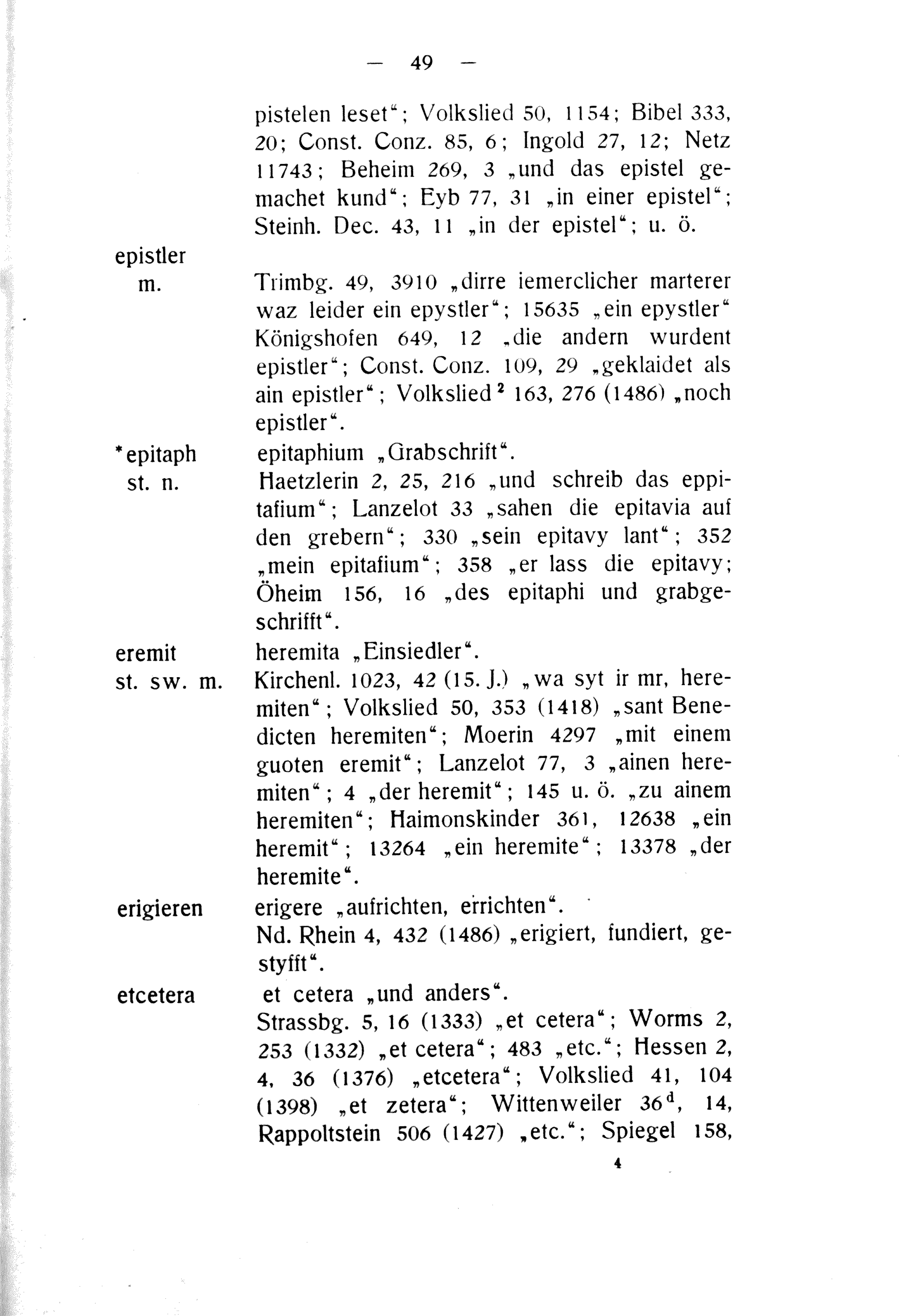 Trimbg. 49, 3010„dirre iemerclicher marterer waz leider ein epystler“; 15635„ein epystler“ Königshofen 649, 12„die andern wurdent epistler“; Const. Conz. 100, 20„geklaidet als ain epistler“; Volkslied* 163, 276(1486)„noch epistler“. epitaphium„Grabschrift“. Haetzlerin 2, 25, 216„und schreib das eppi-— tafium“; Lanzelot 33„sahen die epitavia auf den grebern“; 330„sSein epitavy lant“; 352 „mein epitafium“; 358„er lass die epitavy; Oheim 1586, 16„des epitaphi und grabge- schrifft“. heremita„Einsiedler“. Kirchenl. 1023, 42(15. J.)„Wa syt ir mr, here- miten“; Volkslied 50, 353(1418)„Sant Bene- dicten heremiten“; Moerin 4207„mit einem guoten eremit“; Lanzelot 77, 3„ainen here- miten“; 4„der heremit“; 145 u. ö.„zu ainem heremiten“; Haimonskinder 361, 12638„ein heremit“; 13264„ein heremite“; 13378„der heremite“. erigere„aufrichten, errichten“. Nd. Rhein 4, 432(1486)„erigiert, fundiert, ge- styfft“. et cetera„und anders“. Strassbg. 5, 16(1333)„et cetera“; Worms 2, 253(1332)„et cetera“; 483„etc.“; Hessen 2, 4. 36(1376)„etcetera“; Volkslied 41, 104 (1398)„et zetera“; Wittenweiler 36¹, 14, Rappoltstein 506(1427)„etc.“; Spiegel 158, 4