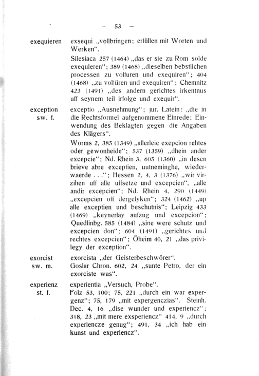 Silesiaca 257(1464)„das er sie zu Rom solde exequieren“; 380(1468)„dieselben bebstlichen processen zu volfuren und exequiren“; 404 (1468)„Zu volfüren und exequiren“; Chemnit⸗z 423(1491)„des andern gerichtes irkentnus uff seynem teil irfolge und exequir“.