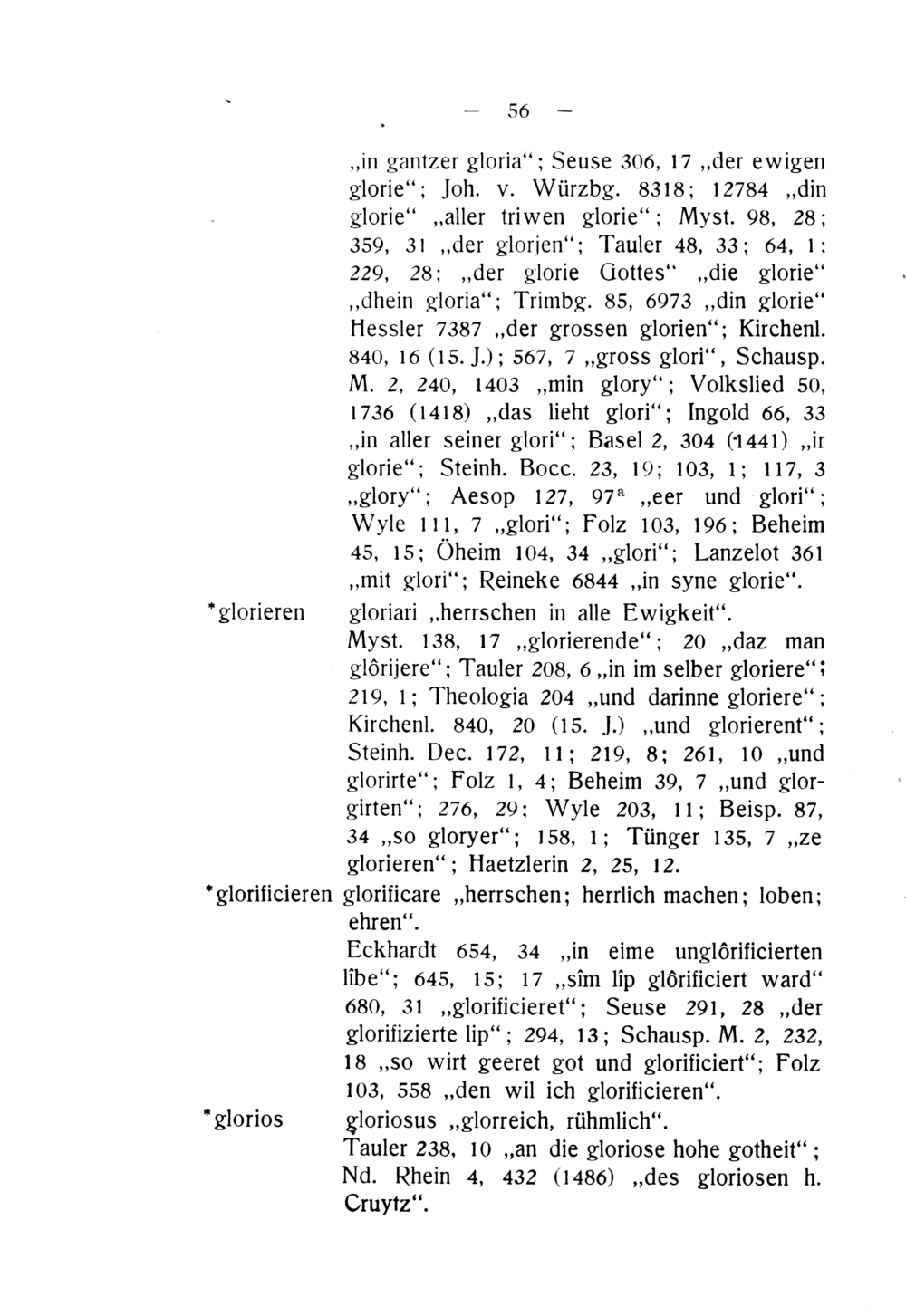 „in gantzer gloria“; Seuse 306, 17„der ewigen glorie“; Joh. v. Würzbg. 8318; 12784„din glorie“„aller triwen glorie“; Myst. 98, 28; 359, 31„der glorjen“; Tauler 48, 33; 64, 1: 229, 28;„der glorie Gottes“„die glorie“ „Ghein gloria“; Trimbg. 85, 6973„din glorie“ Hessler 7387„der grossen glorien“; Kirchenl. 840, 16(15. J.); 567, 7„gross glori“, Schausp. M. 2, 240, 1403„min glory“; Volkslied 50, 1736(1418)„das lieht glori“; Ingold 66, 33 „in aller seiner glori“; Basel 2, 304(1441)„ir glorie“; Steinh. Bocc. 23, 19; 103, 1; 117, 3 „glory“; Aesop 127, 97²„eer und glori“; Wyle 111, 7„glori“; Folz 103, 196; Beheim 45, 15; Oheim 104, 34„glori“; Lanzelot 361 „mit glori“; Reineke 6844„in syne glorie“.