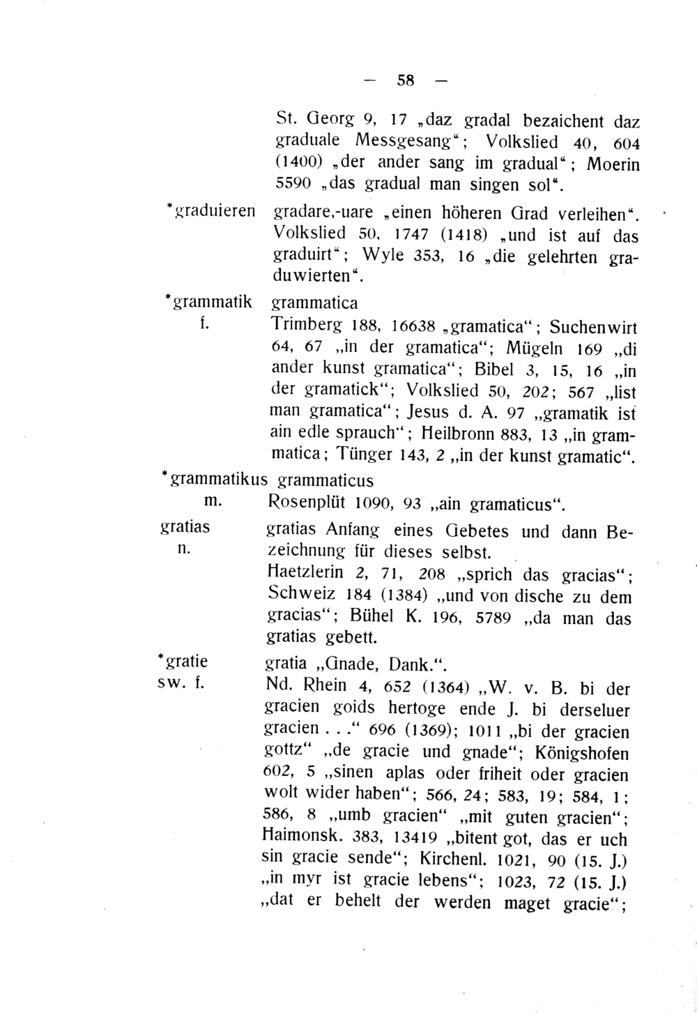 Trimberg 188, 16638„gramatica“; Suchenwirt 64, 67„in der gramatica“; Mügeln 160„di ander Kkunst gramatica“; Bibel 3, 15, 16„In der gramatick“; Volkslied 50, 202; 567„list man gramatica“; Jesus d. A. 97„gramatik ist ain edle sSprauch“; Heilbronn 883, 13„in gram- matica; Tünger 143, 2„in der kunst gramatic“.