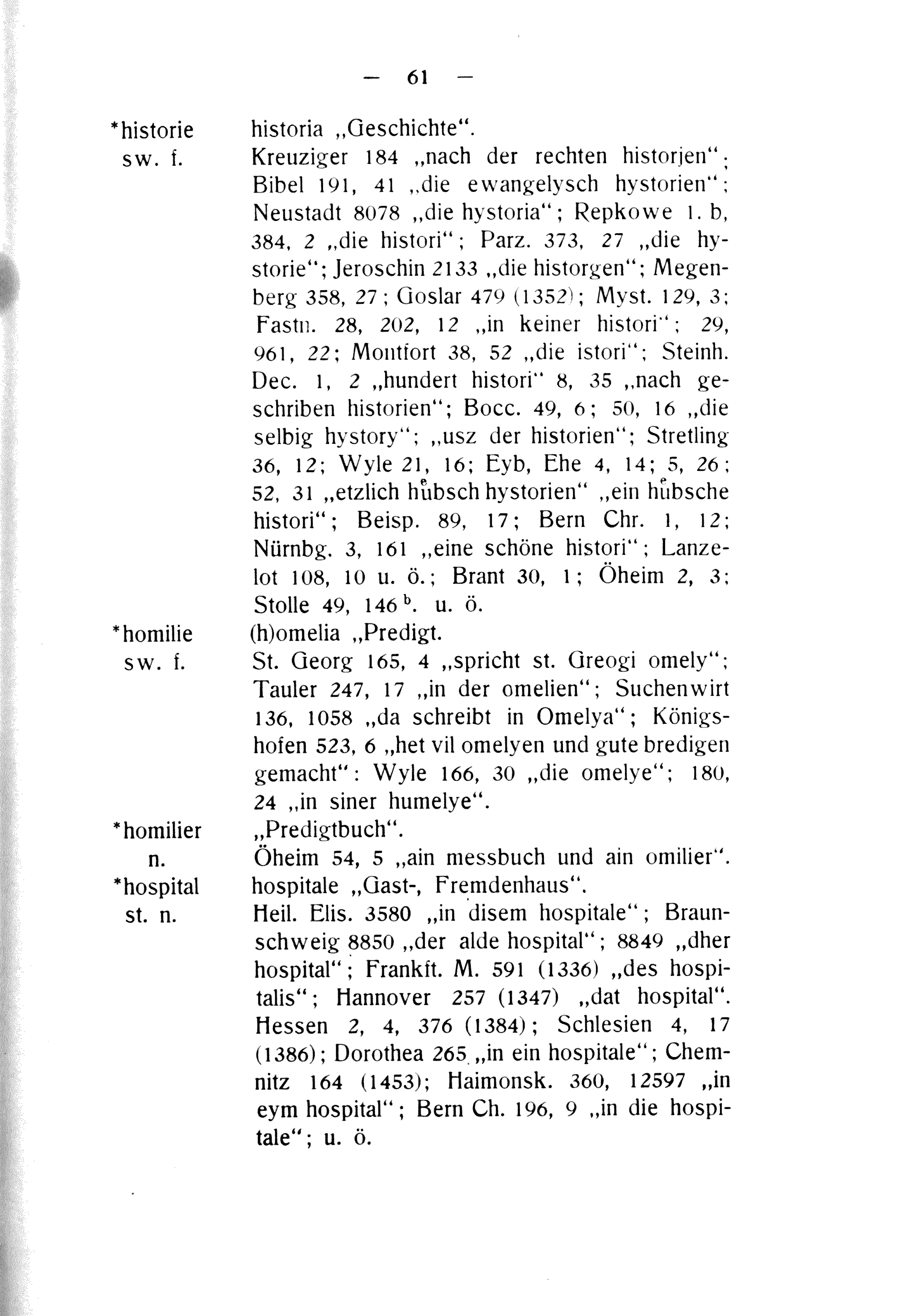 Oheim 54, 5„ain messbuch und ain omilier“. hospitale„Gast-, Fremdenhaus“.