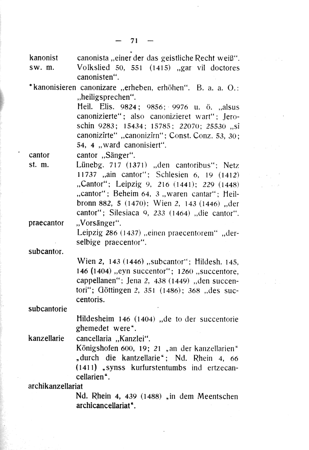 st. m. Lünebg. 717(1371)„den cantoribus“; Net- 11737„ain cantor“; Schlesien 6, 19(1412) „Cantor“; Leipzig°, 216(1441); 229(1448) „Cantor“; Beheim 64, 3„waren cantar“; Heil-— bronn 882, 5(1470); Wien 2, 143(1446)„der cantor“; Silesiaca 0, 233(1464)„die cantor“.
