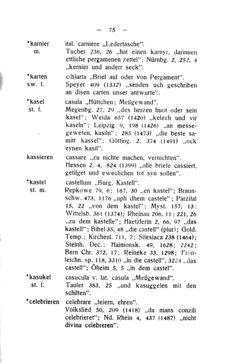 Megenbg. 27, 20„des herzen huot oder sein kasel“; Weida 657(1420)„Kkelech und vir kaseln“; Leipzig 9, 198(1426)„an messe- geweten, Kkasiln“; 285(1473)„die beste sa- mitt kassel“: Götting. 2, 374(1491)„ock eynen Kasil“.