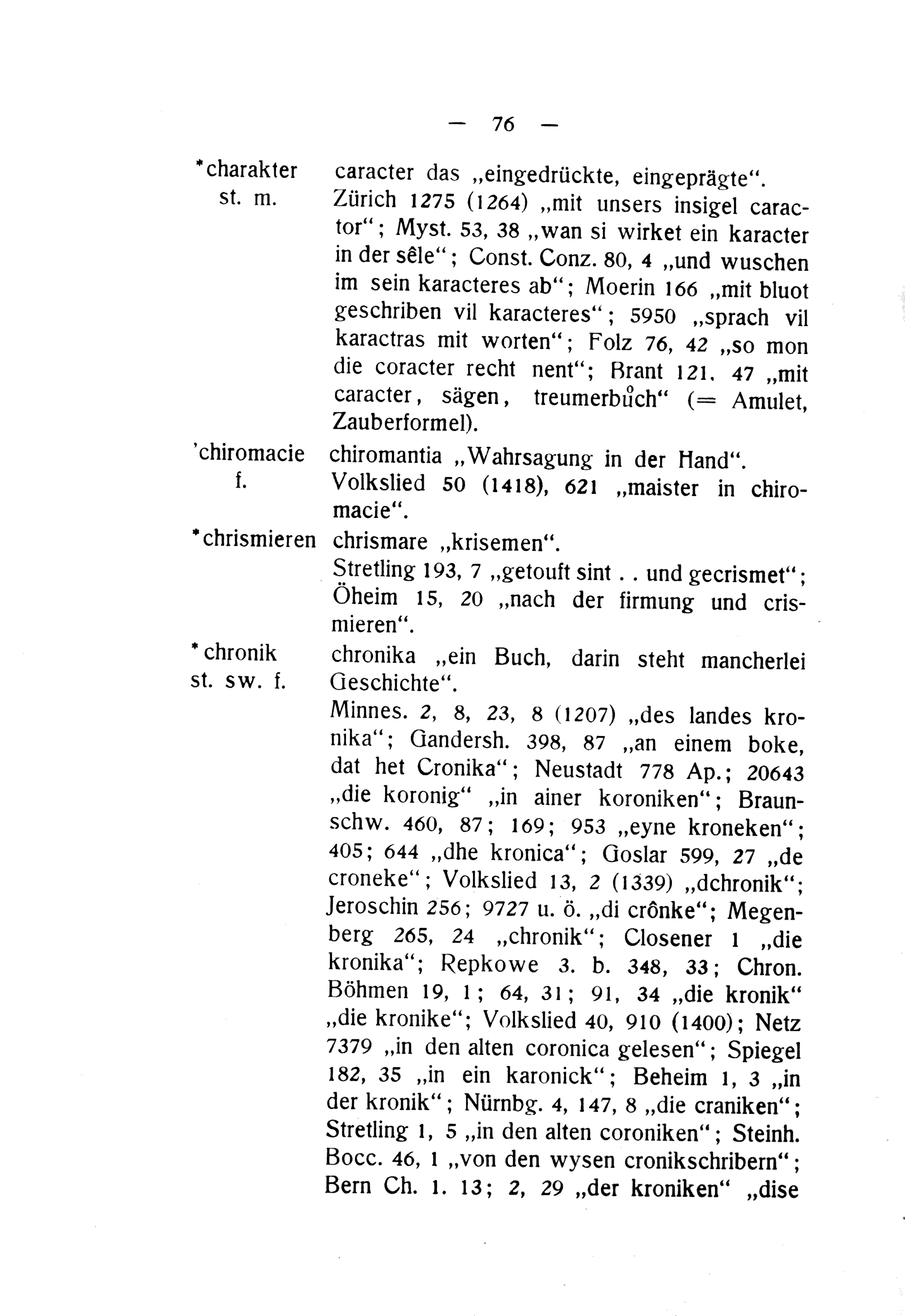 Zürich 1275(1264)„mit unsers insigel carac- tor“; Myst. 53, 38„wan si wirket ein karacter in der séèle“; Const. Conz. 80, 4„und wuschen im sein karacteres ab“; Moerin 166„mit bluot geschriben vil karacteres“; 5950„Sprach vil Karactras mit worten“; Folz 76, 42„So mon die coracter recht nent“; Brant 121. 47„Iit