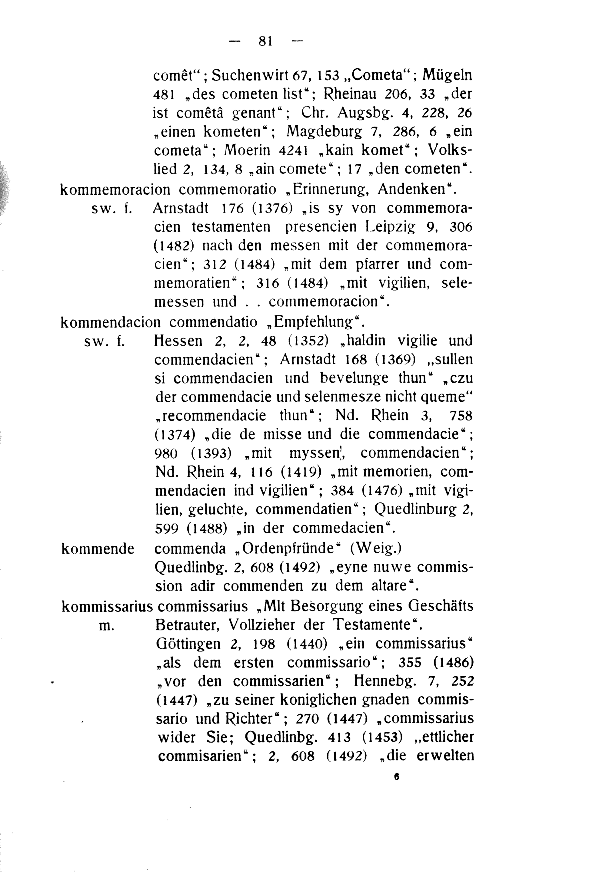 SW. f. Hessen 2, 2, 48(1352)„haldin vigilie und commendacien“; Arnstadt 168(1360)„sullen si commendacien und bevelunge thun“„czu der commendacie und selenmesze nicht queme“ „recommendacie thun“; Nd. Rhein 3, 758 (1374)„die de misse und die commendacie“; 980(1393)„mit myssen, commendacien“; Nd. Rhein 4, 116(1419)„mit memorien, com- mendacien ind vigilien“; 384(1476)„mit vigi- lien, geluchte, commendatien“; Quedlinburg 2, 590(1488)„in der commedacien“.
