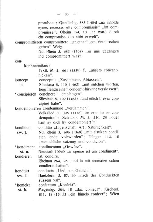 kondempnieren condemnare„verdammen“. Volkslied 50, 130(1418)„an eren ist er con-