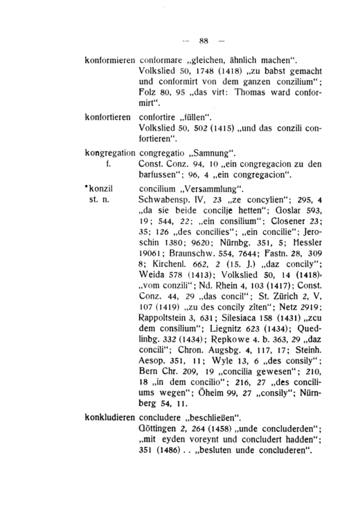 Schwabensp. IV, 23„ze concylien“; 295, 4 „da sie beide concilje hetten“; Goslar 503, 19; 544, 22;„ein consilium“; Closener 23; 35; 126„des concilies“;„ein concilie“; Jero- schin 1380; 9620; Nürnbg. 351, 5; Hessler 19061; Braunschw. 554, 7644; Fastn. 28, 300 8; Kirchenl. 662, 2(15. J.)„daz concily“; Weida 578(1413); Volkslied 50, 14(1418), „Vvom conzili“; Nd. Rhein 4, 103(1417); Const. Conz. 44, 29„das concil“; St. Zürich 2, V, 107(1419)„Zu des concily ziten“; Netz 2019; Rappoltstein 3, 631; Silesiaca 158(1431)„2zcu dem consilium“; Liegnitz 623(1434); Qued- linbg. 332(1434); Repkowe 4. b. 363, 20„daz concili“; Chron. Augsbg. 4, 117, 17; Steinh. Aesop. 351, 11; Wyle 13, 6„des consily“; Bern Chr. 209, 19„Cconcilia gewesen“; 210, 18„in dem concilio“; 216, 27„des concili- ums wegen“; Oheim 90, 27„consily“; Nürn- berg 54, 11.