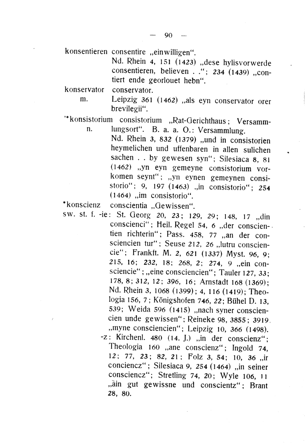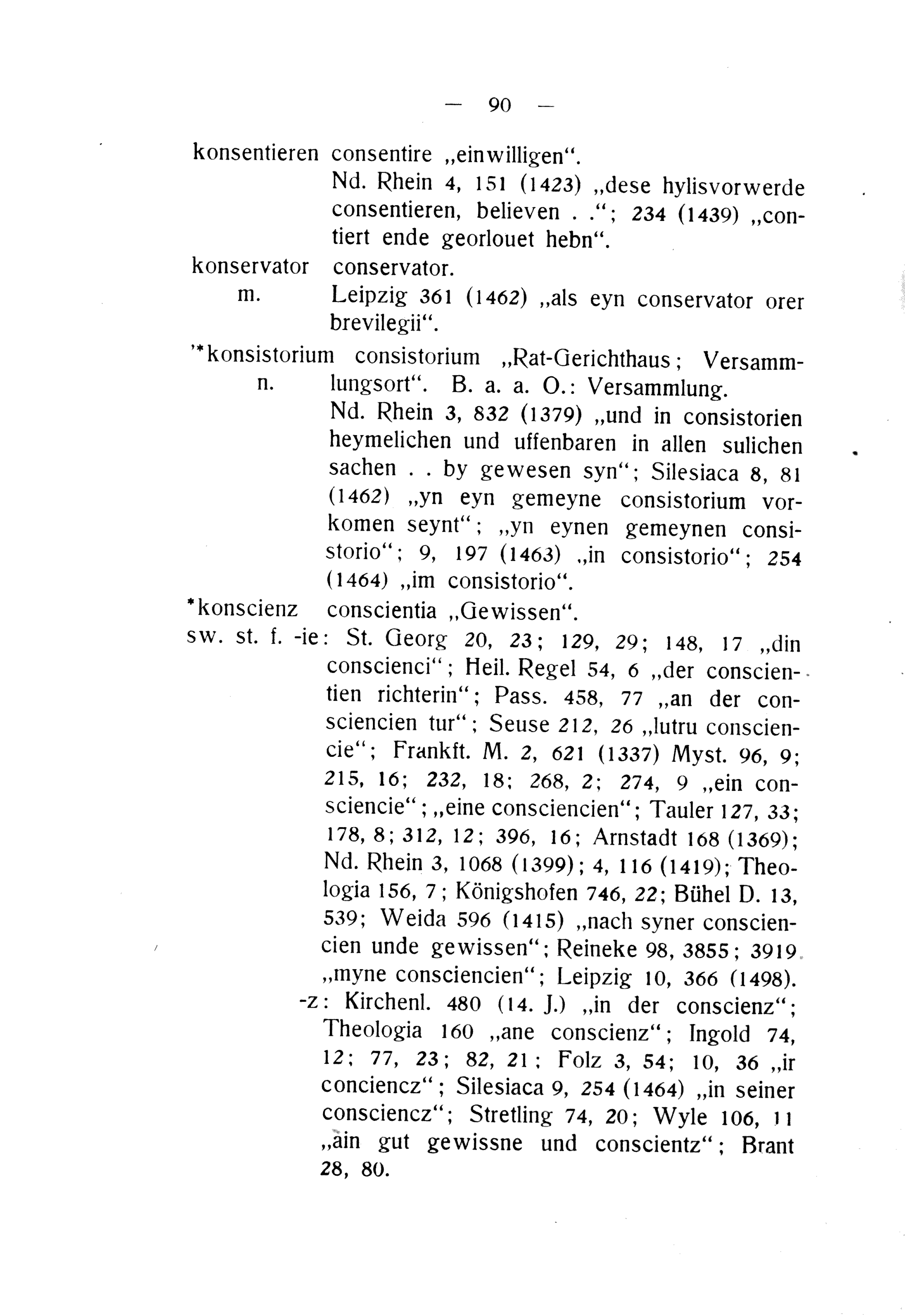 Nd. Rhein 3, 832(1379)„und in consistorien heymelichen und uffenbaren in allen sulichen sachen.. by gewesen syn“; Silesiaca 8, 81 (1462)„yn eyn gemeyne consistorium vor- komen seynt“;„yn eynen gemeynen consi- storio“; 9, 197(1463)„in consistorio“; 254 (1464)„im consistorio“. konscienz conscientia„Gewissen“. sW. St. f.-je: St. Georg 20, 23; 129, 29; 148, 17„din conscienci“; Heil. Regel 54, 6„der conscien- tien richterin“; Pass. 458, 77„an der con- sciencien tur“; Seuse 212, 26„lutru conscien- cie“; Frankft. M. 2, 621(1337) Myst. 96, 9; 215, 16; 232, 18: 268, 2; 274, 9„ein con- sciencie“;„eine consciencien“; Tauler 127, 33; 178, 8; 312, 12; 396, 16; Arnstadt 168(1360); Nd. Rhein 3, 1068(1390); 4, 116(1419); Theo- logia 156, 7; Königshofen 746, 22; Bühel D. 13, 539; Weida 596(1415)„nach syner conscien- cien unde gewissen“: Reineke 98, 3855; 3919. „myne consciencien“; Leipzig 10, 366(1498). z: Kirchenl. 480(14. J.)„in der conscienz“; Theologia 160„ane conscienz“; Ingold 74, 12; 77, 23; 82, 21; Folz 3, 54; 10, 36„ir conciencz“; Silesiaca d, 254(1464)„in seiner consciencz“; Stretling 74, 20; Wyle 106, 11 „àin gut gewissne und conscientz“; Brant 28, 80.