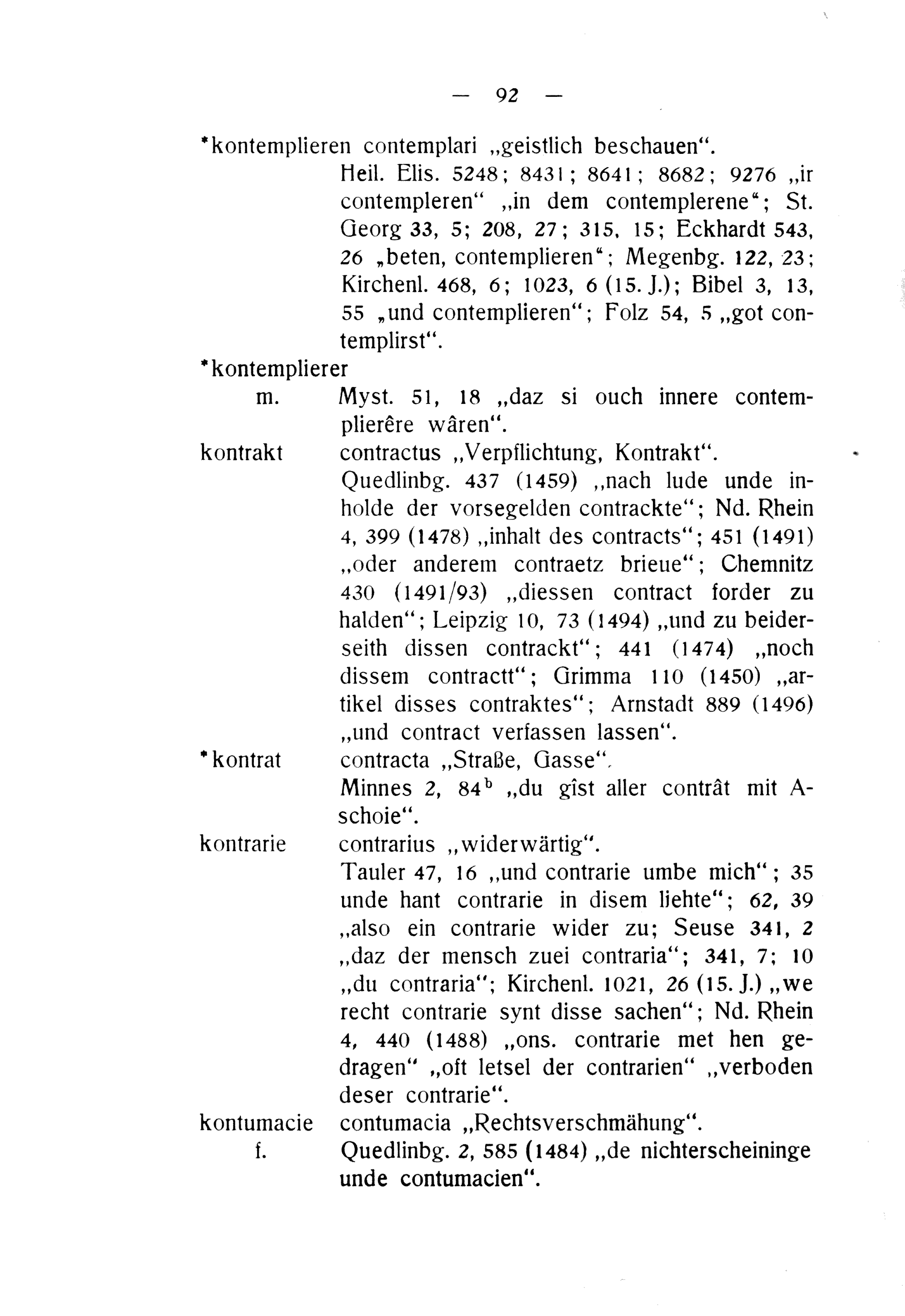 contractus„Verpflichtung, Kontrakt“. OQuedlinbg. 437(1450)„nach lude unde in- holde der vorsegelden contrackte“; Nd. Rhein 4, 390(1478)„inhalt des contracts“; 451(1491) „oder anderem contraetz brieue“; Chemnitz 430(1491/93)„diessen contract forder zu halden“; Leipzig 10, 73(1494)„und zu beider- seith dissen contrackt“; 441(1474)„noch dissem contractt“; Grimma 110(1450)„ar- tikel disses contraktes“; Arnstadt 889(1496) „und contract verfassen lassen“.