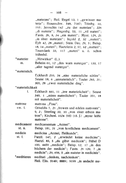 matrone“.: medicament medicamentum„Arznei“. st. n. Beisp. 181, 31„von kostlichem medicament“. medizin medicina„Arznei, Heilkunde“. st. f. Parzif. 147, 2„erwindet keine medicine“;