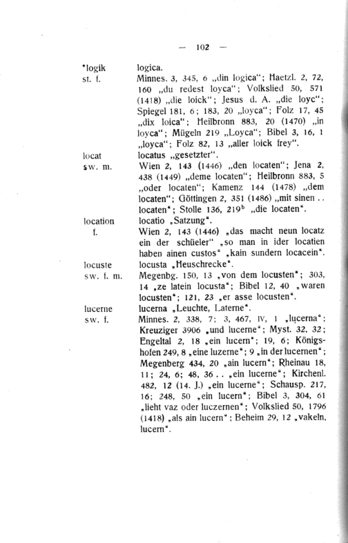 Minnes. 3, 345, 6„din logica“; Haetzl. 2, 72, 160„du redest loyca“; Volkslied 50, 571 (1418)„die loick“; Jesus d. A.„die loyc“; Spiegel 181, 6; 183, 20„loyca“; Folz 17, 45 „dix loica“; Heilbronn 883, 20(1470)„in loyca“; Mügeln 219„Loyca“; Bibel 3, 16, 1 „loyca“; Folz 82, 13„aller loick frey“. locatus„gesetzter“.