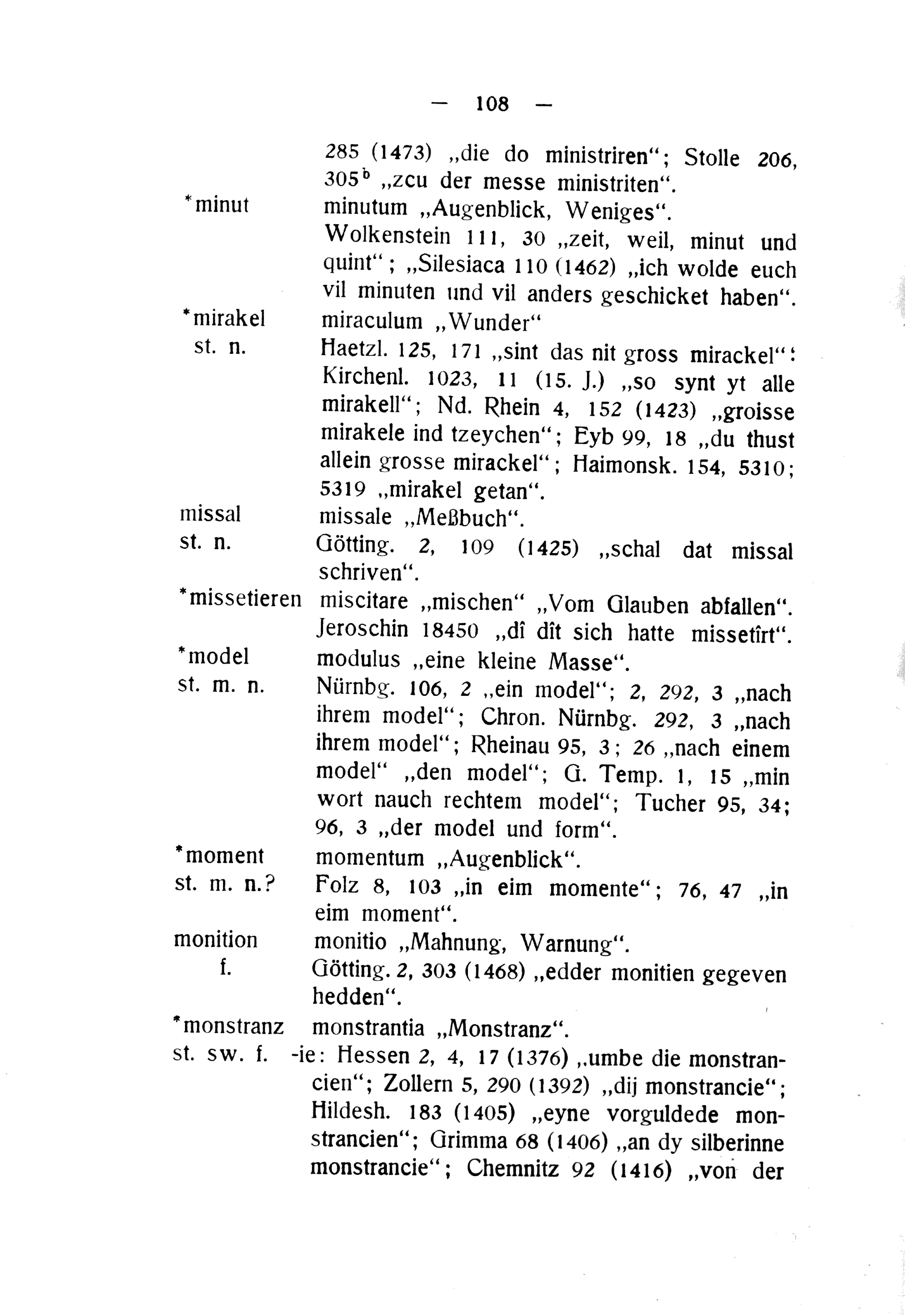 minutum„Augenblick, Weniges“. Wolkenstein 111, 30„zeit, weil, minut und quint“;„Silesiaca 110(1462)„ich wolde euch vil minuten umd vil anders geschicket haben“. miraculum„Wunder“