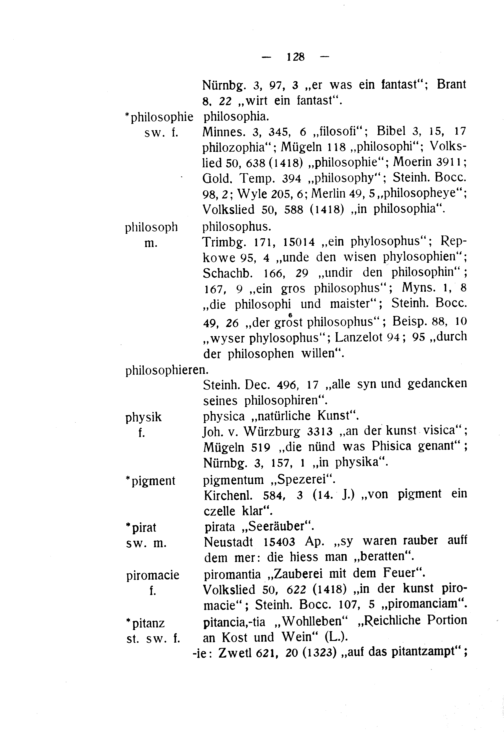 Minnes. 3, 345, 6„filosofi“; Bibel 3, 15, 17 philozophia“; Mügeln 118„philosophi“; Volks- lied 50, 638(1418)„philosophie“; Moerin 3011; Gold. Temp. 3904„philosophy“; Steinh. Bocc. 98, 2; Wyle 205, 6; Merlin 40, 5„Pphilosopheye“:; Volkslied 50, 588(1418)„in philosophia“. philosophus.