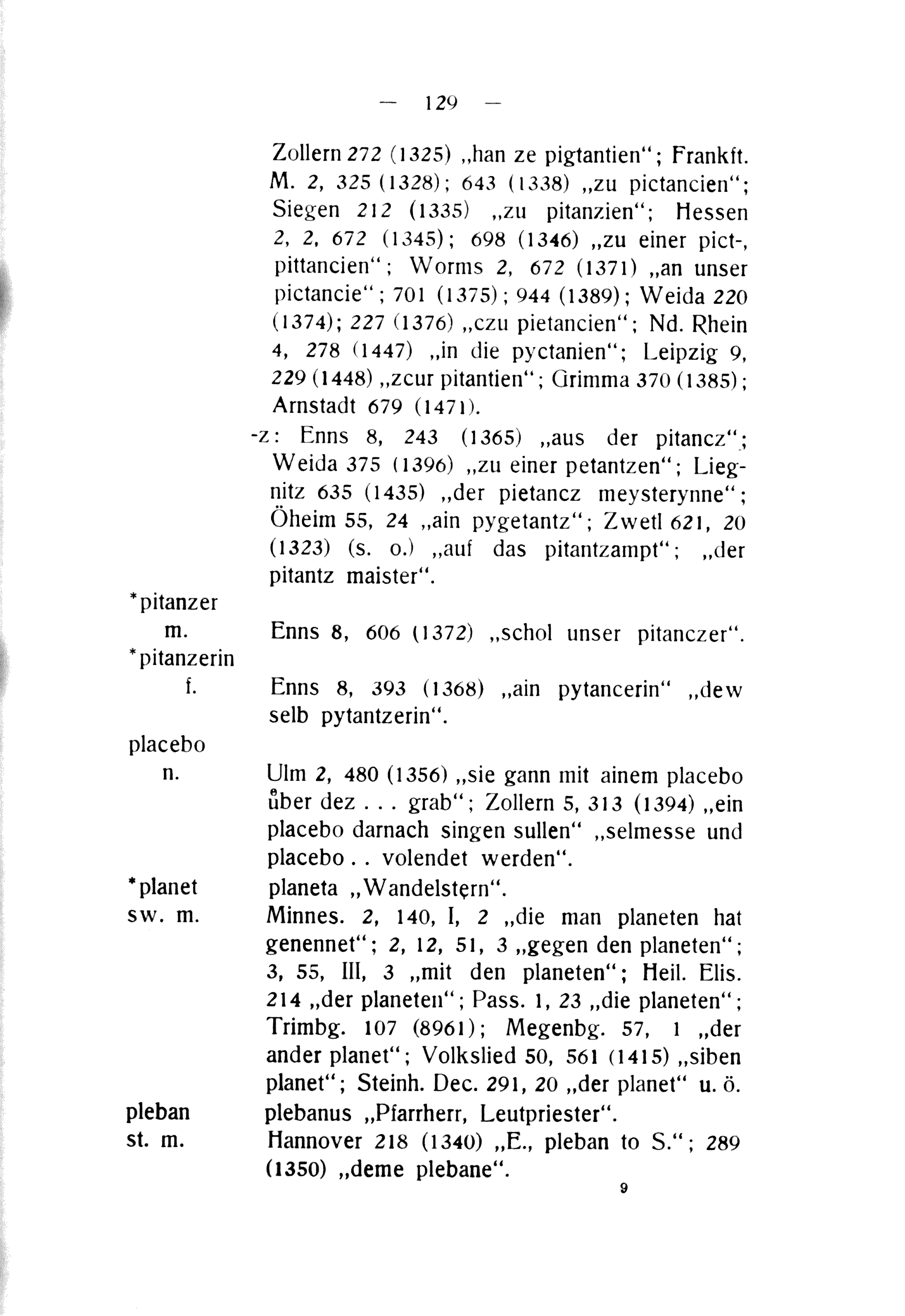 *pitanzer m. Enns 8, 600(1372)„Schol unser pitanczer“. *pitanzerin f. Enns 8, 303(1368)„ain pytancerin“„dew selb pytantzerin“. placebo n. Ulm 2, 480(1356)„Sie gann mit ainem placebo uͤber dez... grab“; Zollern 5, 313(1394)„ein placebo darnach singen sullen“„selmesse und placebo.. volendet werden“. *planet planeta„Wandelstern“. sw. m. Minnes. 2, 140, lI, 2„die man planeten hat genennet“; 2, 12, 51, 3„gegen den planeten“: 3, 55, III, 3„mit den planeten“; Heil. Flis. 214„der planeten“; Pass. 1, 23„die planeten“:; Trimbg. 107(8061); Megenbg. 57, 1„der ander planet“; Volkslied 50, 561(1415)„Siben planet“; Steinh. Dec. 291, 20„der planet“ u. ö. pleban plebanus„Pfarrherr, Leutpriester“. st. m. Hannover 218(1340)„E., pleban to S.“; 289
