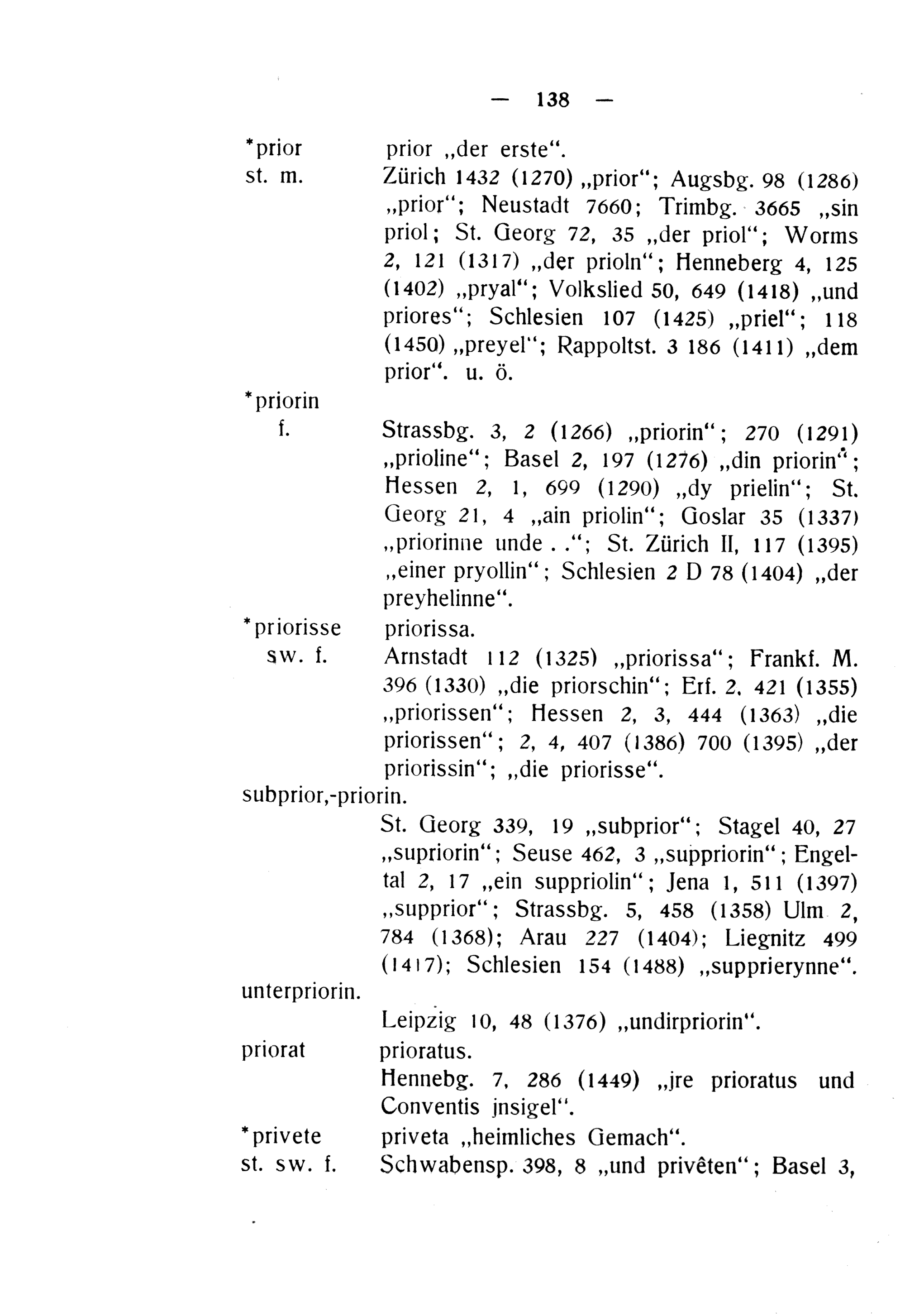 subprior,-priorin. St. Georg 330, 19„Subprior“; Stagel 40, 27 „Supriorin“; Seuse 462, 3„suppriorin“; Engel-— tal 2, 17„ein suppriolin“; Jena 1, 511(1397) „Supprior“; Strassbg. 5, 458(1358) Ulm 2, 784(1368); Arau 227(1404); Liegnitz 490 (1417); Schlesien 154(1488)„Supprierynne“.