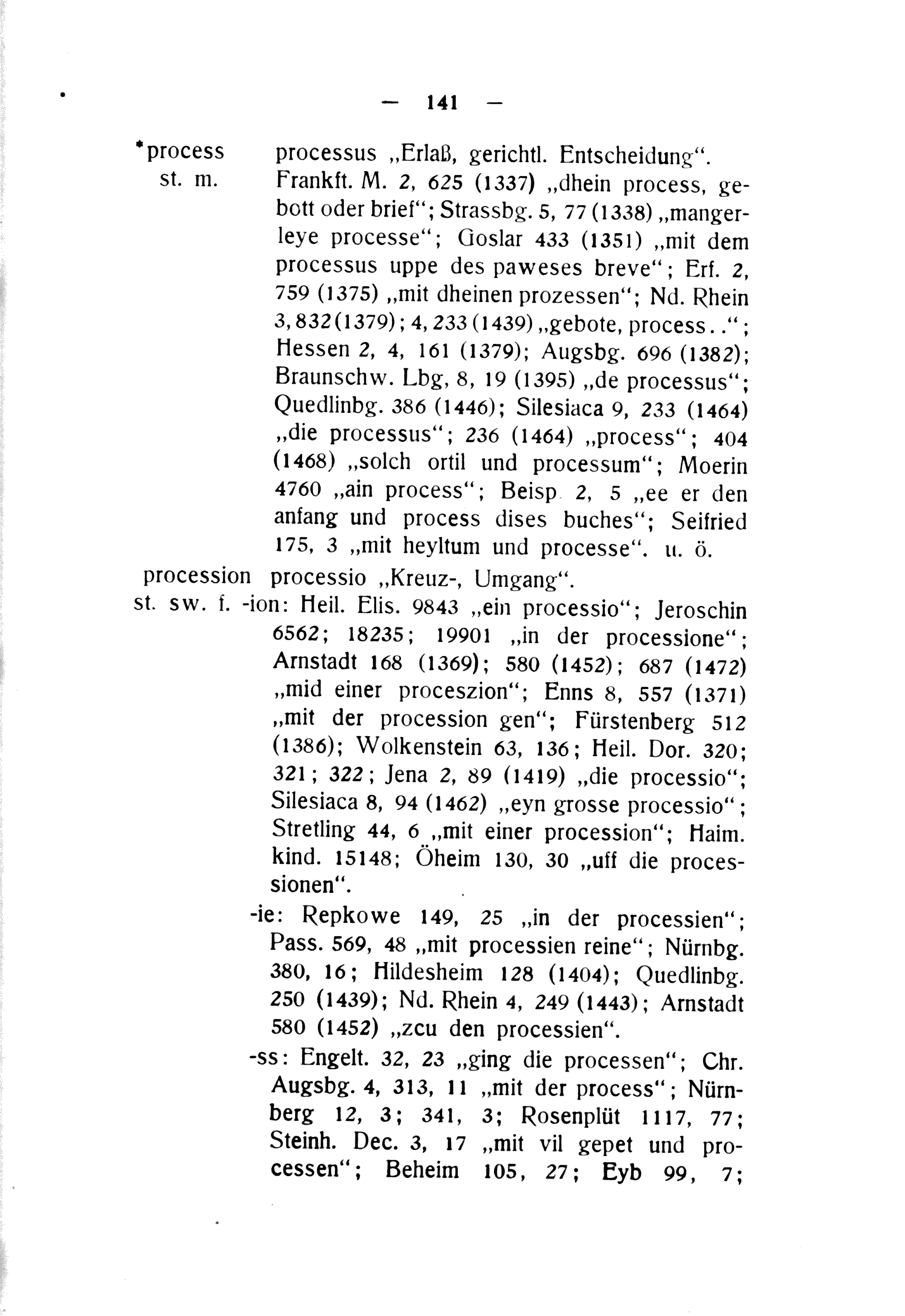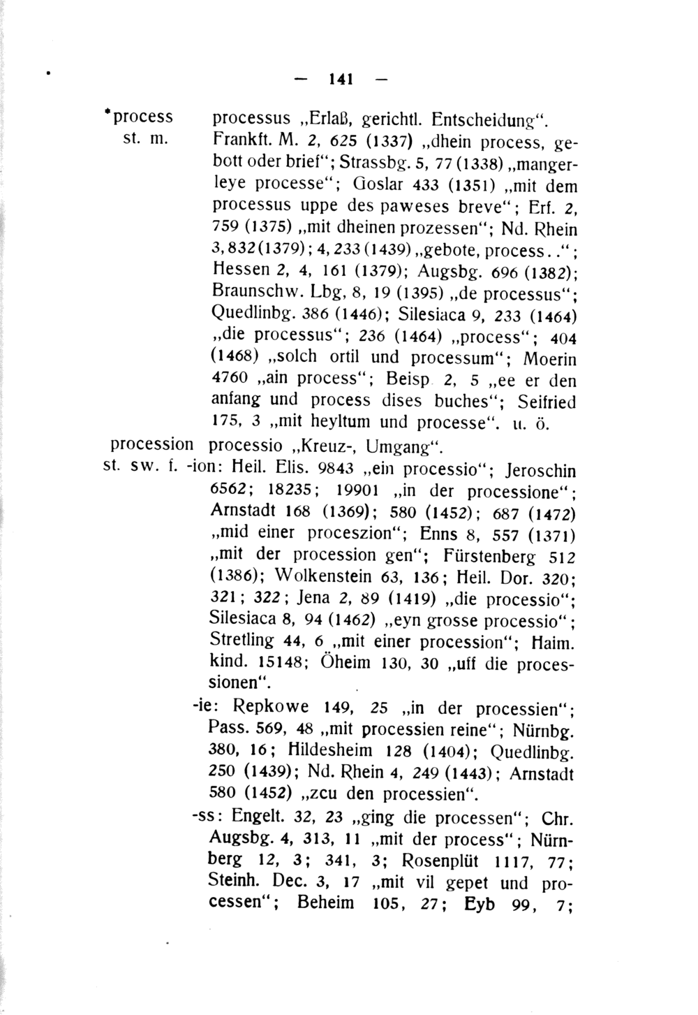 Frankft. M. 2, 625(1337)„dhein process, ge- bott oder brief“; Strassbg. 5, 77(1338)„manger- leye processe“; Goslar 433(1351)„mit dem processus uppe des paweses breve“; Erf. 2, 759(1375)„mit dheinen prozessen“; Nd. Rhein 3, 832(1379); 4, 233(1430)„gebote, process..“; flessen 2, 4, 161(1379); Augsbg. 606(1382); Braunschw. Lbg, 8, 19(1398)„de processus“; Quedlinbg. 386(1446); Silesiaca 9, 233(1464) „die processus“; 236(1464)„process“; 404 (1468)„Solch ortil und processum“; Moerin 4760„ain process“; Beisp. 2, 5„ee er den anfang und process dises buches“; Seifried 175, 3„mit heyltum und processe“. u. ö.
