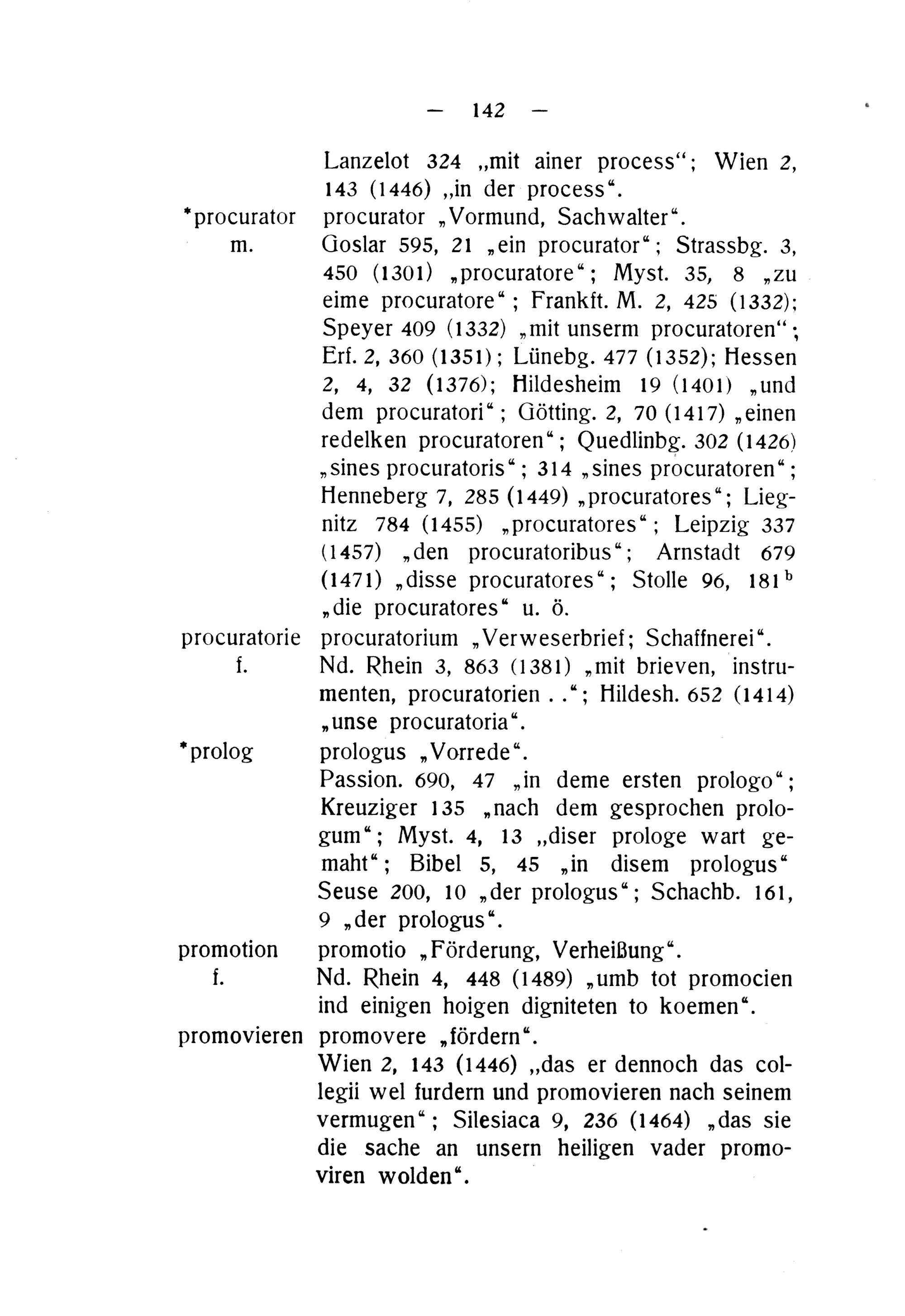 Goslar 595, 21„ein procurator“; Strassbg. 3, 450(1301)„procuratore“; Myst. 35, 8„zu eime procuratore“; Frankft. M. 2, 425(1332); Speyer 400(1332)„mit unserm procuratoren“; Erf. 2, 360(1351); Lünebg. 477(1352); Hessen 2, 4, 32(1376); Hildesheim 10(1401)„und dem procuratori“; Götting. 2, 70(1417)„einen redelken procuratoren“; Quedlinbg. 302(1426) „Sines procuratoris“; 314„sines procuratoren“; Henneberg 7, 285(1449)„procuratores“; Lieg- nitz 784(1455)„procuratores“; Leipzig 337 (1457)„den procuratoribus“; Arnstadt 679 (1471)„disse procuratores“; Stolle 96, 181 b „die procuratores“ u. ö.