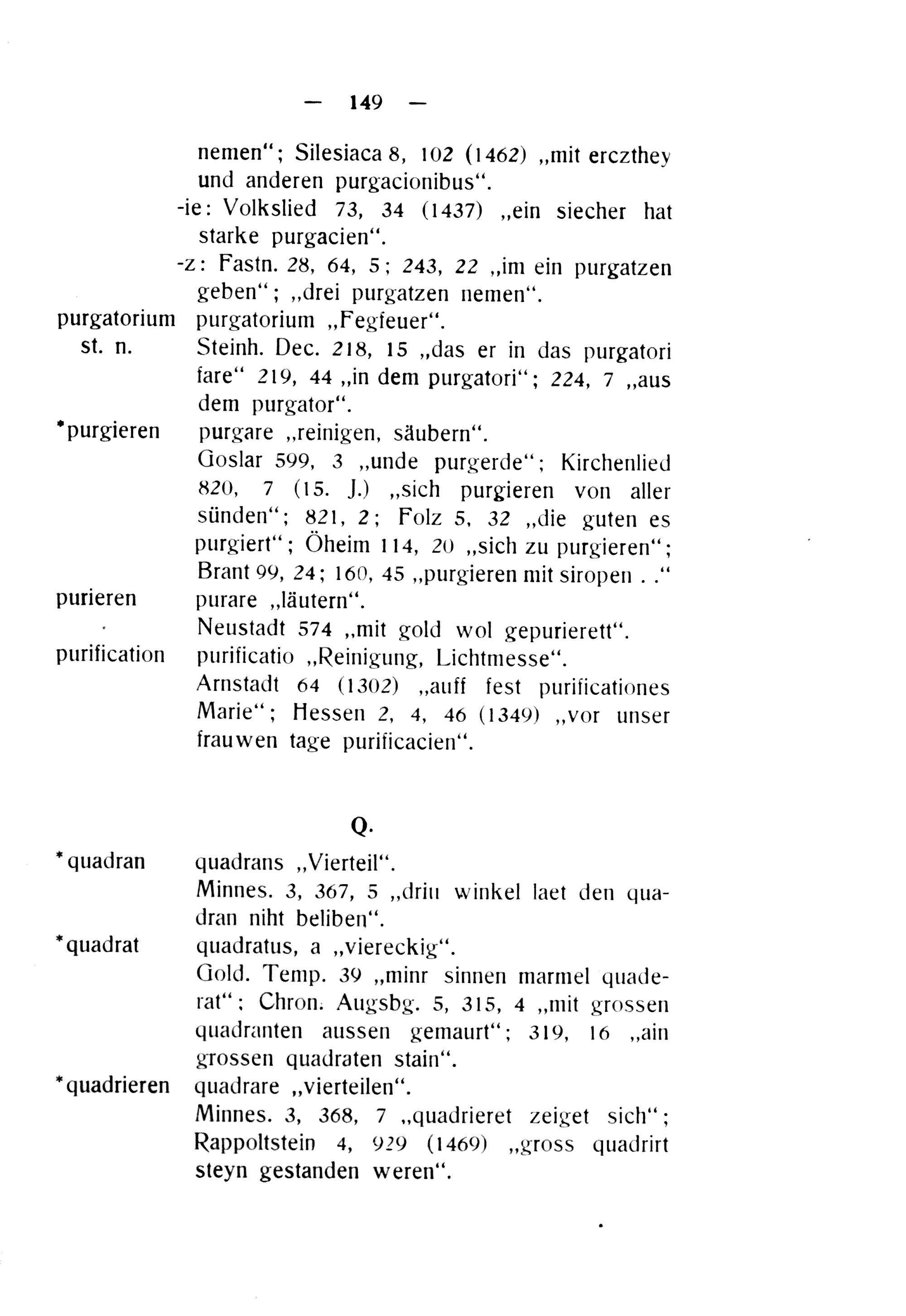 Goslar 509, 3„unde purgerde“; Kirchenlied 820, 7(15. J.)„sich purgieren von aller sünden“; 821, 2; Folz 5. 32„die guten es purgiert“; Oheim 114, 20„sich zu purgieren“; Brant 09, 24; 160, 45„purgieren mit siropen..“ purare„läutern“.