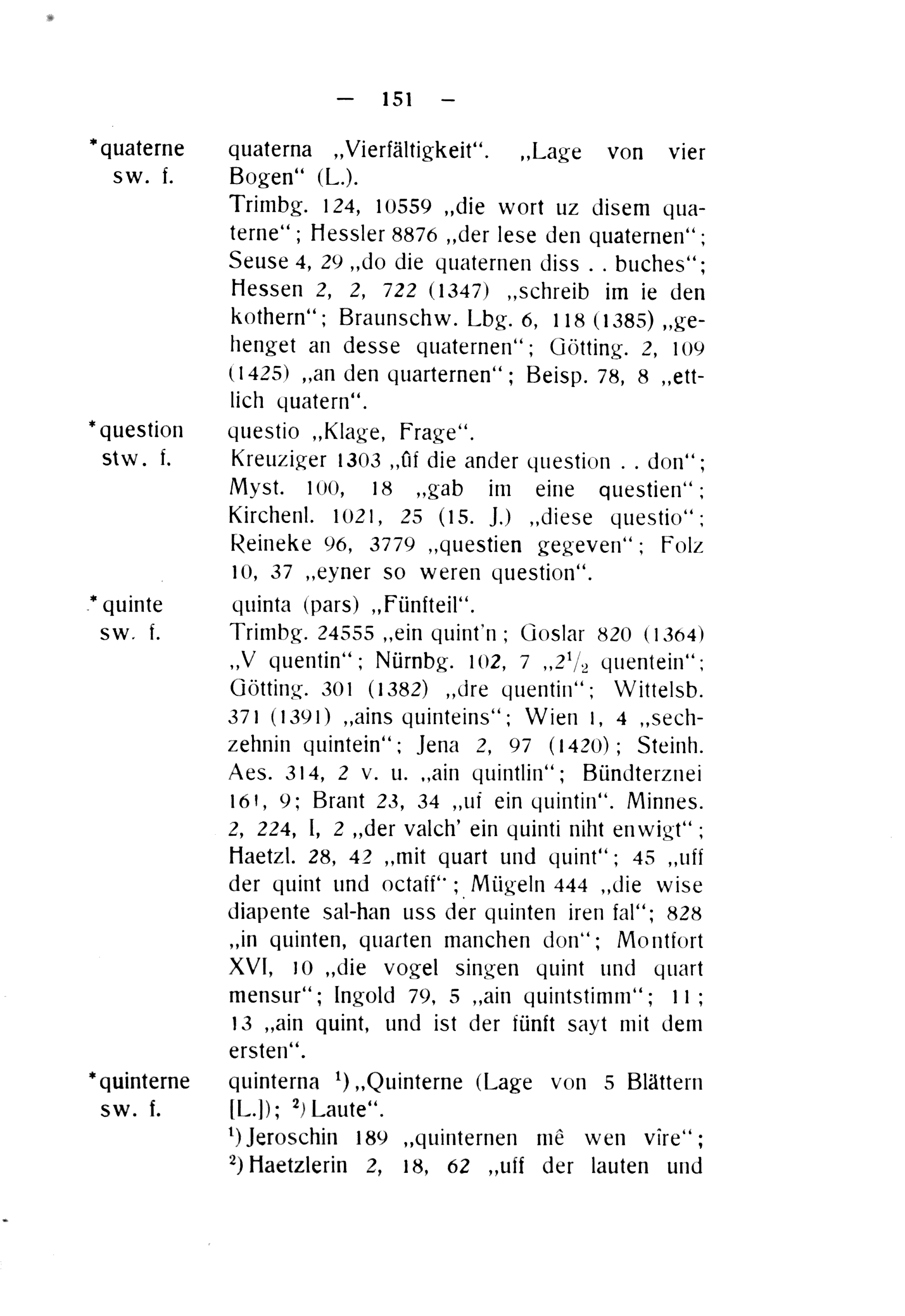 Trimbg. 24555„ein quint'n; Goslar 820(1364) „V quentin“; Nürnbg. 102, 7„2 ½ quentein“: Götting. 301(1382)„dre quentin“; Wittelsb. 371(1301)„ains quinteins“; Wien 1, 4„Sech-— zehnin quintein“; Jjena 2, 97(1420); Steinh. Aes. 314, 2 v. u.„ain quintlin“; Bündterznei 161, 9; Brant 23, 34„uf ein quintin“. Minnes. 2, 224, l, 2„der valch' ein quinti niht enwigt“:; Haetzl. 28, 42„mit quart und quint“; 45„uff der quint und octaff“; Mügeln 444„die wise diapente sal-han uss der quinten iren fal“; 828 „in quinten, quarten manchen don“; Montfort XVI, 10„die vogel singen quint und quart mensur“; Ingold 79, 5„ain quintstimm“; 11; 13„ain quint, und ist der fünft sayt mit dem ersten“.