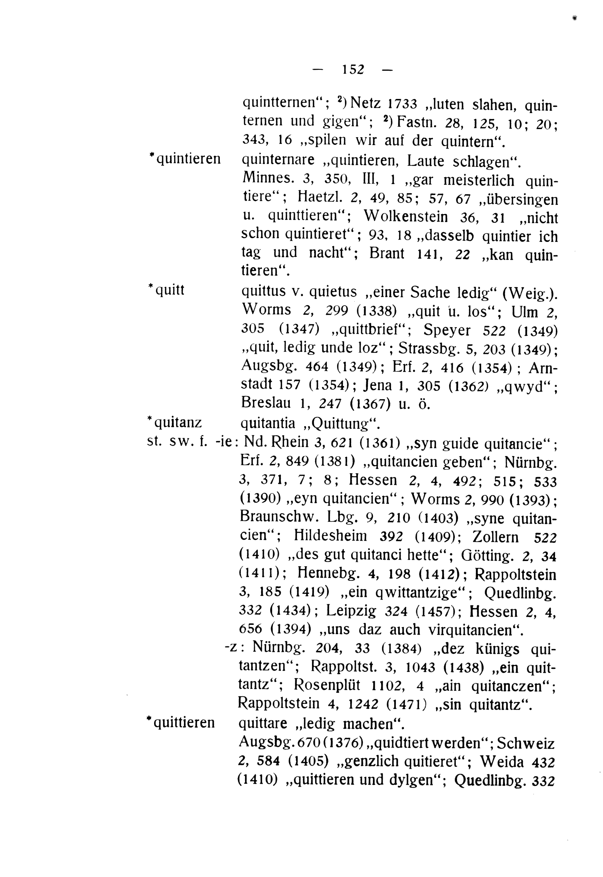 quittus v. quietus„einer Sache ledig“(Weig.). Worms 2, 209(1338)„quit u. los“; Ulm 2, 305(1347)„quittbrief“; Speyer 522(13409) „Cuit, ledig unde loz“; Strassbg. 5, 203(1349); Augsbg. 464(1349); Erf. 2, 416(1354); Arn- stadt 157(1354); Jena 1, 305(1362)„qwyd“; Breslau 1, 247(1367) u. ö.