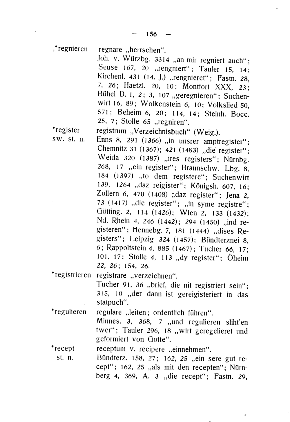 Enns 8, 201(1366)„in unsrer amptregister“; Chemnitz 31(1367); 421(1483)„die register“; Weida 320(1387)„ires registers“; Nürnbg. 268, 17„ein register“; Braunschw. Lbg. S8, 184(1397)„to dem registere“; Suchenwirt 139, 1264„daz reigister“; Königsh. 607, 16; Zollern 6, 470(1408)„daz register“; jena 2, 73(1417)„die register“;„in syme registre“; Götting. 2, 114(1426); Wien 2, 133(1432); Nd. Rhein 4, 246(1442); 294(1450)„ind re- gisteren“; Hennebg. 7, 181(1444)„dises Re- gisters“; Leipzig 324(1457); Bündterznei 8, 6; Rappoltstein 4, 885(1467); Tucher 66, 17; 101, 17; Stolle 4, 113„dy register“; Oheim 22, 26; 154, 26.