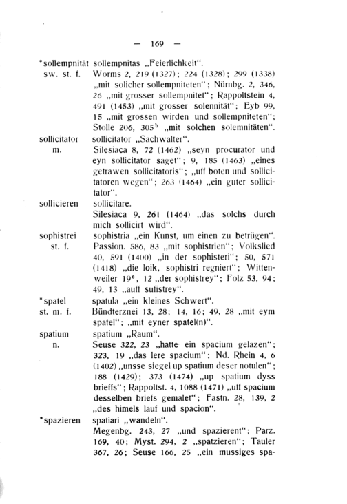 Worms 2, 219(1327): 224(1328); 290(1338) „mit solicher sollempniteten“; Nürnbg. 2, 346, 26„mit grosser sollempnitet“; Rappoltstein 4, 491(1453)„mit grosser solennität“; Eyb 00, 15„mit grossen wirden und sollempniteten“; Stolle 206, 305 b„mit solchen solemnitäten“.