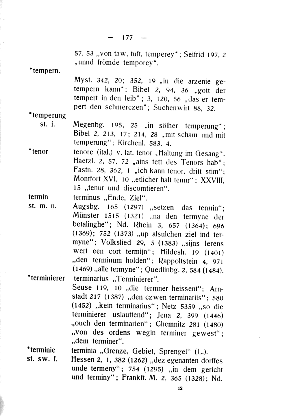 Seuse 119, 10„die termner heissent“; Arn-— stadt 217(1387)„den czwen terminariis“; 580 (1452)„kein terminarius“; Netz 53590„So die terminierer uslauffend“; Jena 2, 300(1446) „ouch den terminarien“; Chemnitz 281(1480) „von des ordens wegin terminer gewest“; „dem terminer“.
