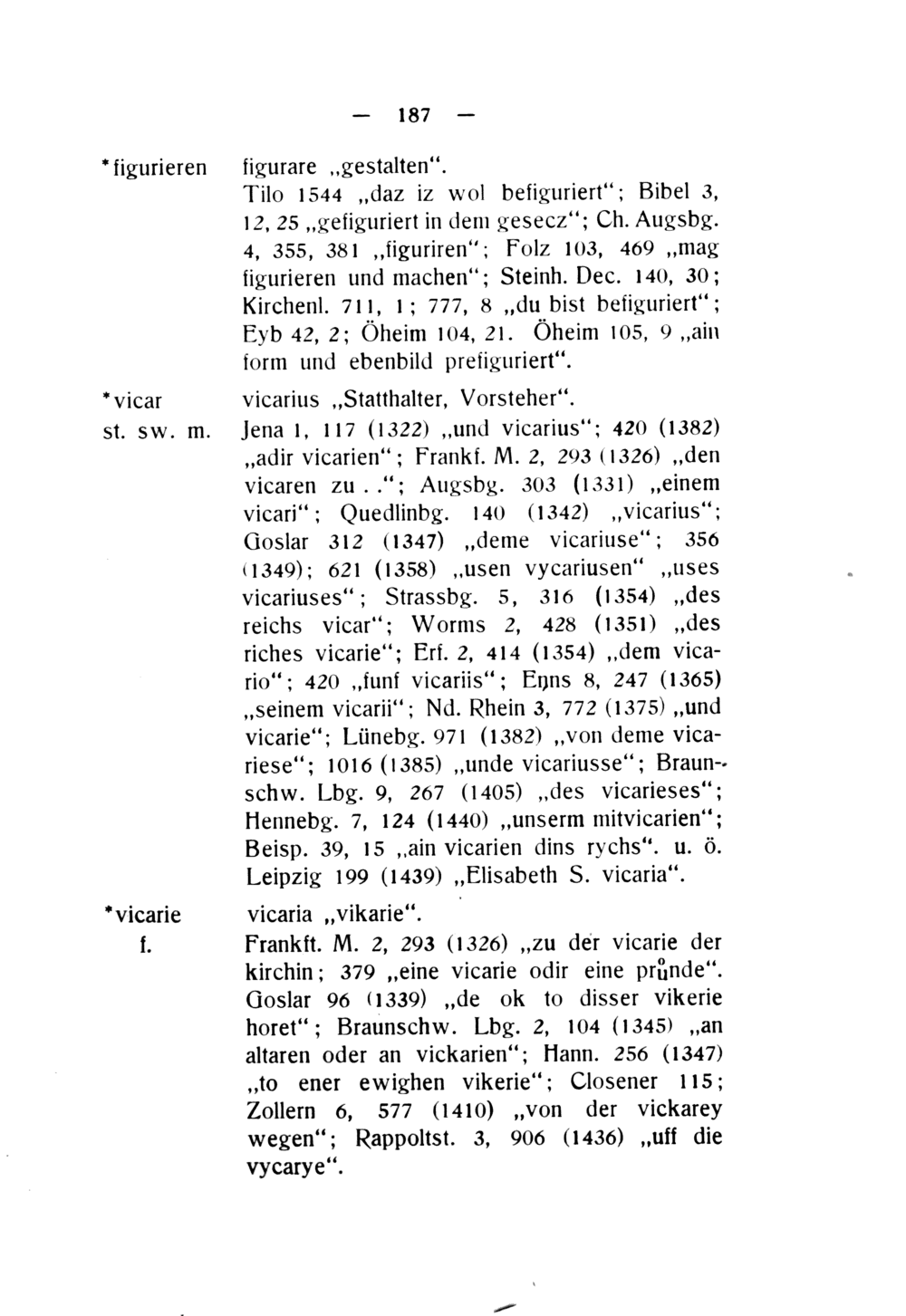 Jena 1, 117(1322)„und vicarius“; 420(1382) „adir vicarien“; Frankf. M. 2, 293(1326)„den vicaren zu..“; Augsbg. 303(1331)„einem vicari“; Quedlinbg. 140(1342)„Vicarius“: Goslar 312(1347)„deme vicariuse“; 3560 (1349); 621(1358)„usen vycariusen“„uses vicariuses“; Strassbg. 5, 316(1354)„des reichs vicar“; Worms 2, 428(1351)„des riches vicarie“; Erf. 2, 414(1354)„dem vica- rio“; 420„funf vicariis“; Eyns 8, 247(1365) „Seinem vicarii“; Nd. Rhein 3, 772(1375)„und vicarie“; Lünebg. 9071(1382)„von deme vica- riese“; 1016(1385)„unde vicariusse“; Braun- schw. Lbg. 9, 267(1405)„des vicarieses“:; Hennebg. 7, 124(1440)„unserm mitvicarien“; Beisp. 30, 15„ain vicarien dins fychs“. u. ö. Leipzig 190(1430)„Elisabeth S. vicaria“.