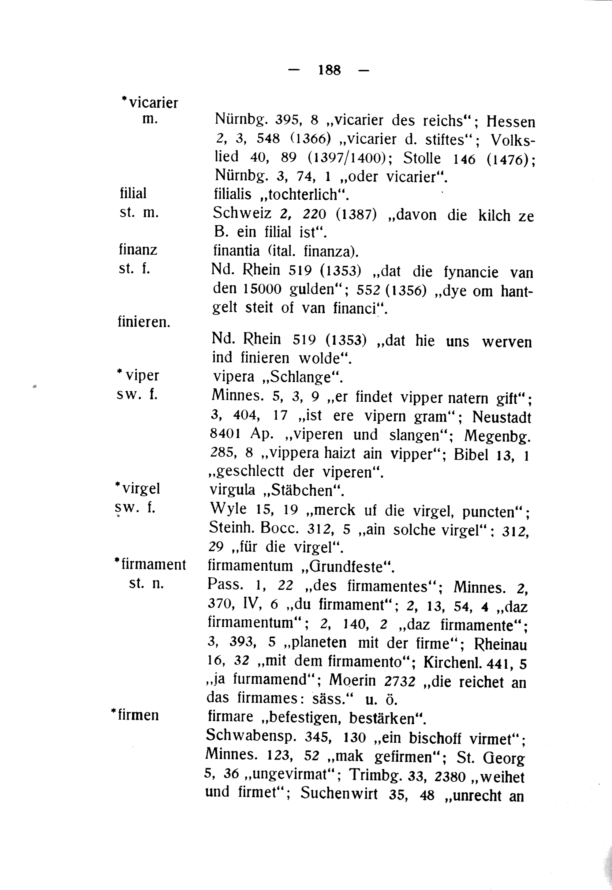 Nürnbg. 305, 8„vicarier des reichs“; Hessen 2, 3, 548(1366)„vicarier d. stiftes“; Volks— lied 40, 80(1397/1400); Stolle 146(1476); Nürnbg. 3, 74, 1„oder vicarier“.