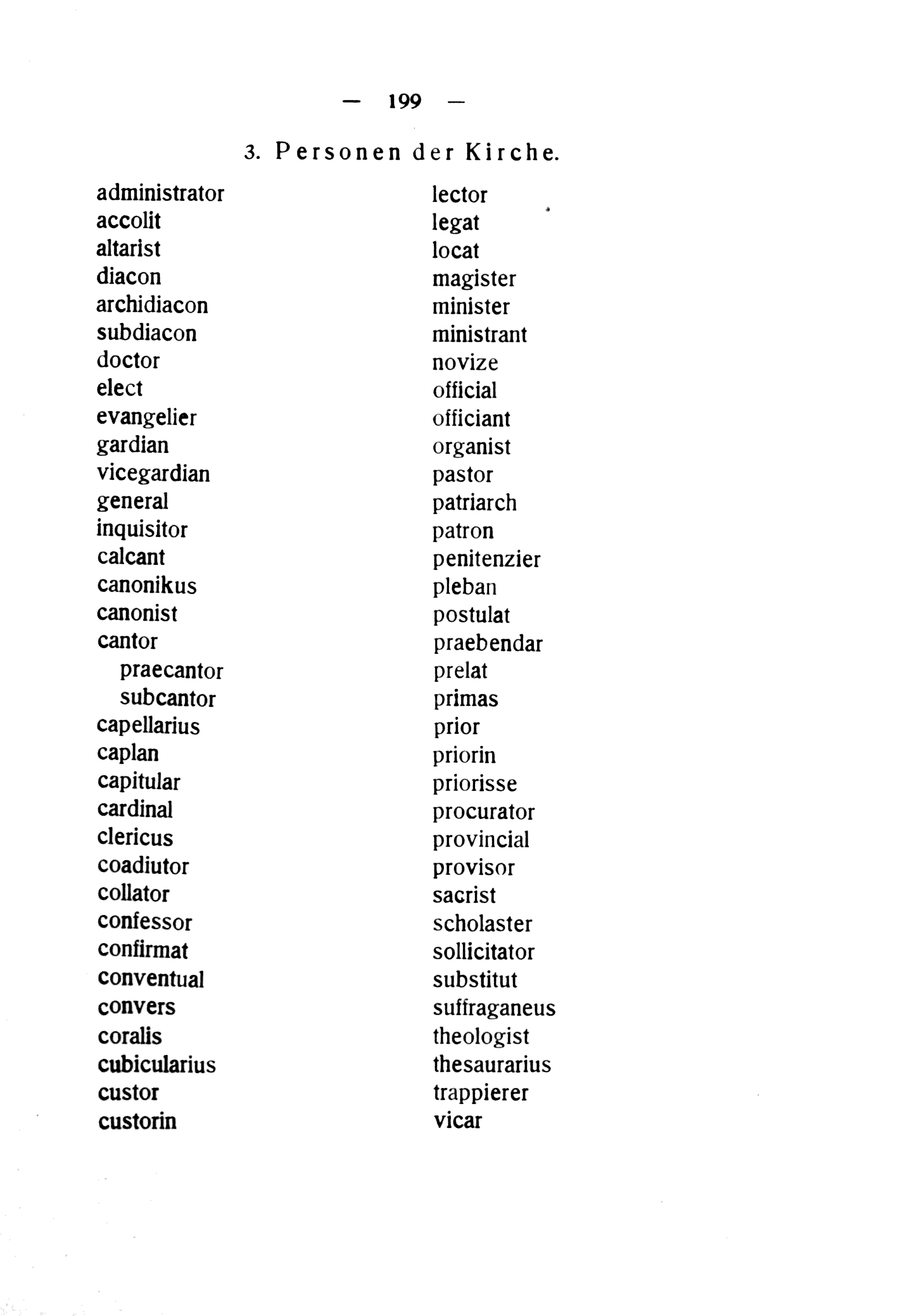 administrator accolit altarist diacon archidiacon subdiacon doctor elect evangelier gardian vicegardian general inquisitor calcant canonikus canonist Cantor praecantor subcantor capellarius caplan capitular cardinal clericus coadiutor collator confessor confirmat conventual convers coralis cubicularius custor custorin