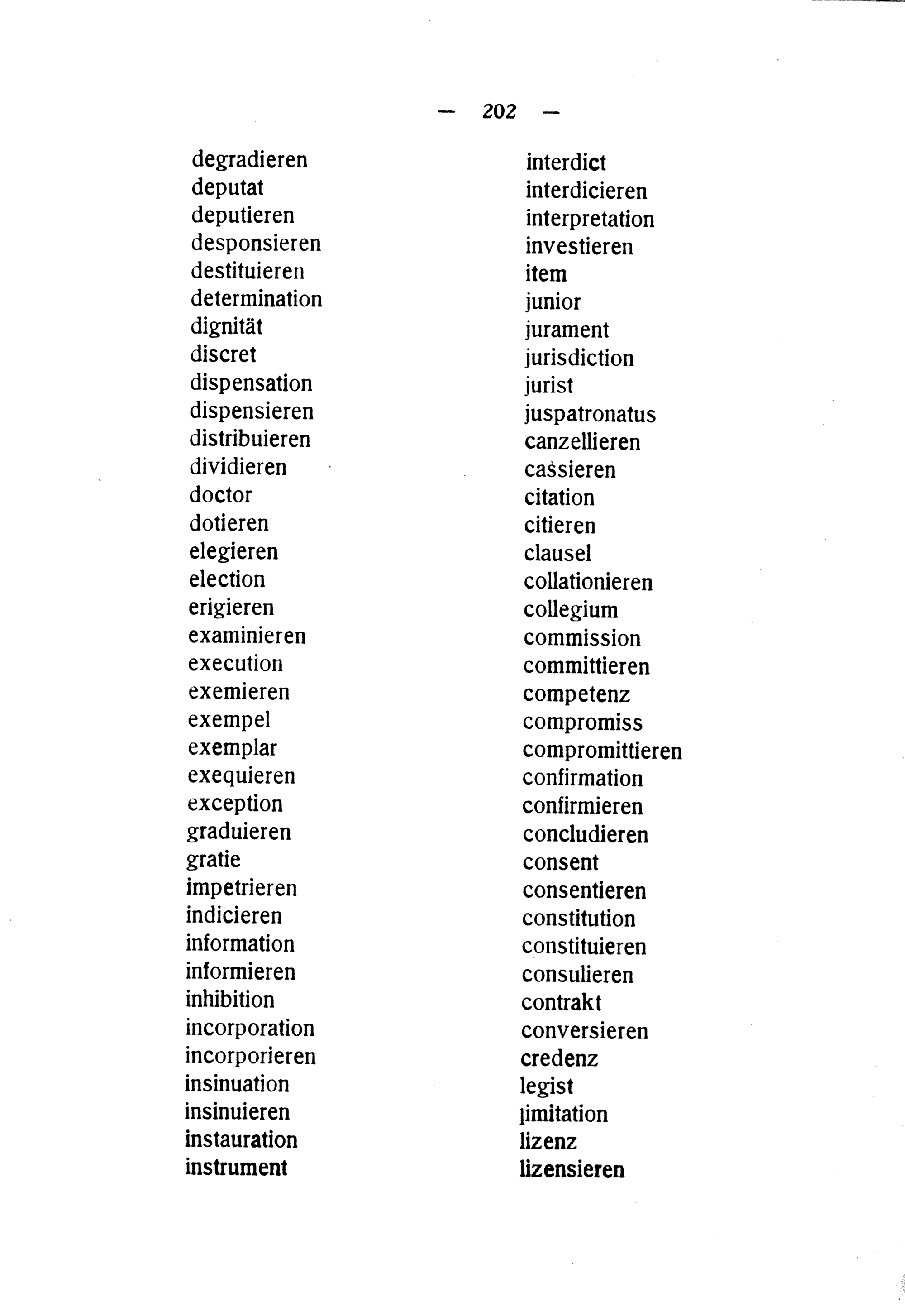 junior jurament jurisdiction jurist juspatronatus canzellieren cassieren citation citieren clausel collationieren collegium commission committieren competenz compromiss compromittieren confirmation confirmieren concludieren consent consentieren constitution constituieren consulieren contrakt conversieren credenz legist limitation lizenz lizensieren