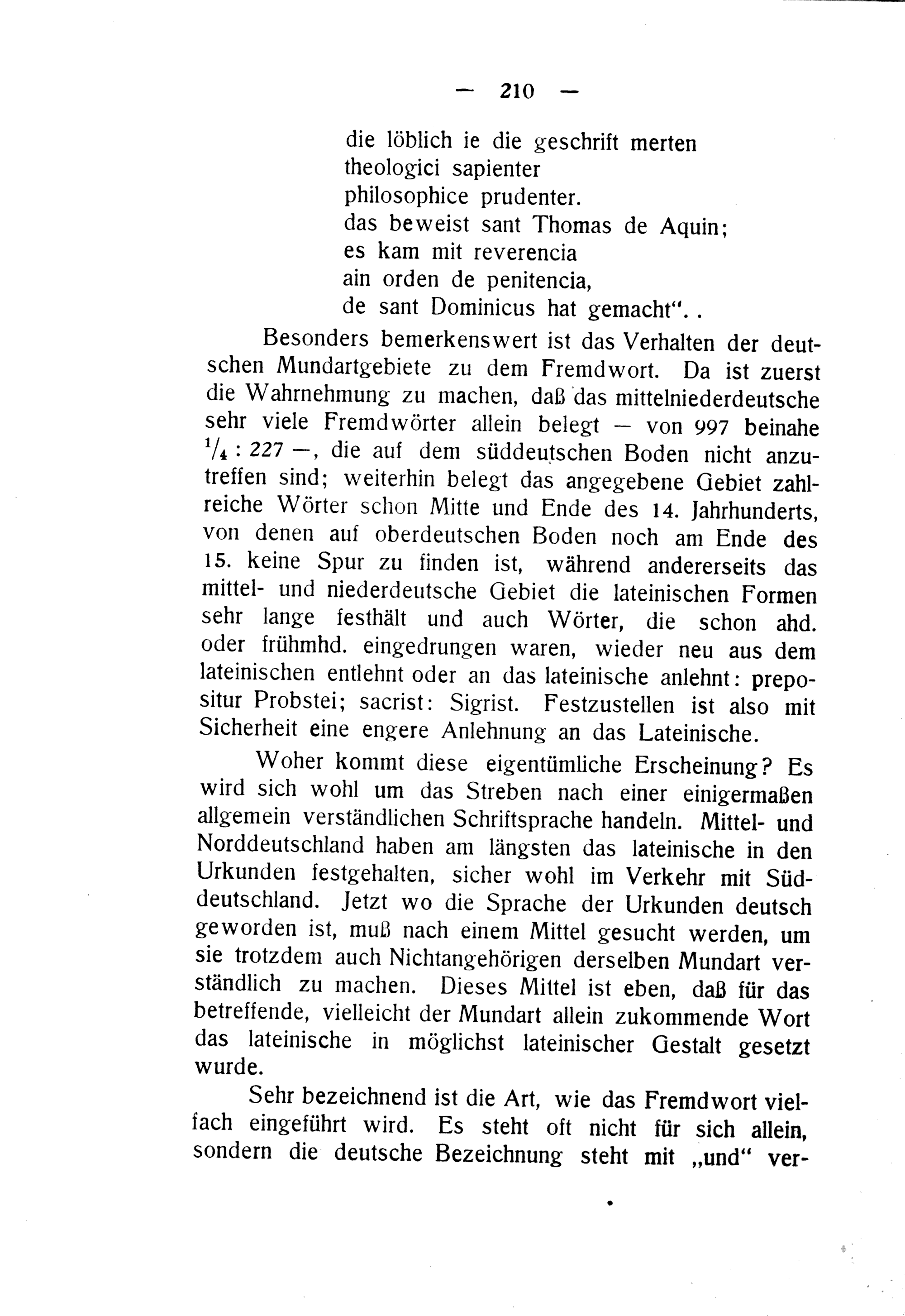Besonders bemerkenswert ist das Verhalten der deut-— schen Mundartgebiete zu dem Fremdwort. Da ist zuerst die Wahrnehmung zu machen, daß das mittelniederdeutsche sehr viele Fremdwörter allein belegt— von 997 beinahe 4¼: 227—, die auf dem süddeutschen Boden nicht anzu-— treffen sind; weiterhin belegt das angegebene Gebiet zahl- reiche Wörter schon Mitte und Ende des 14. Jahrhunderts, von denen auf oberdeutschen Boden noch am Ende des 15. keine Spur zu finden ist, während andererseits das mittel- und niederdeutsche Gebiet die lateinischen Formen sehr lange festhält und auch Wörter, die schon ahd. oder frühmhd. eingedrungen waren, wieder neu aus dem lateinischen entlehnt oder an das lateinische anlehnt: prepo- situr Probstei; sacrist: Sigrist. Festzustellen ist also mit Sicherheit eine engere Anlehnung an das Lateinische.