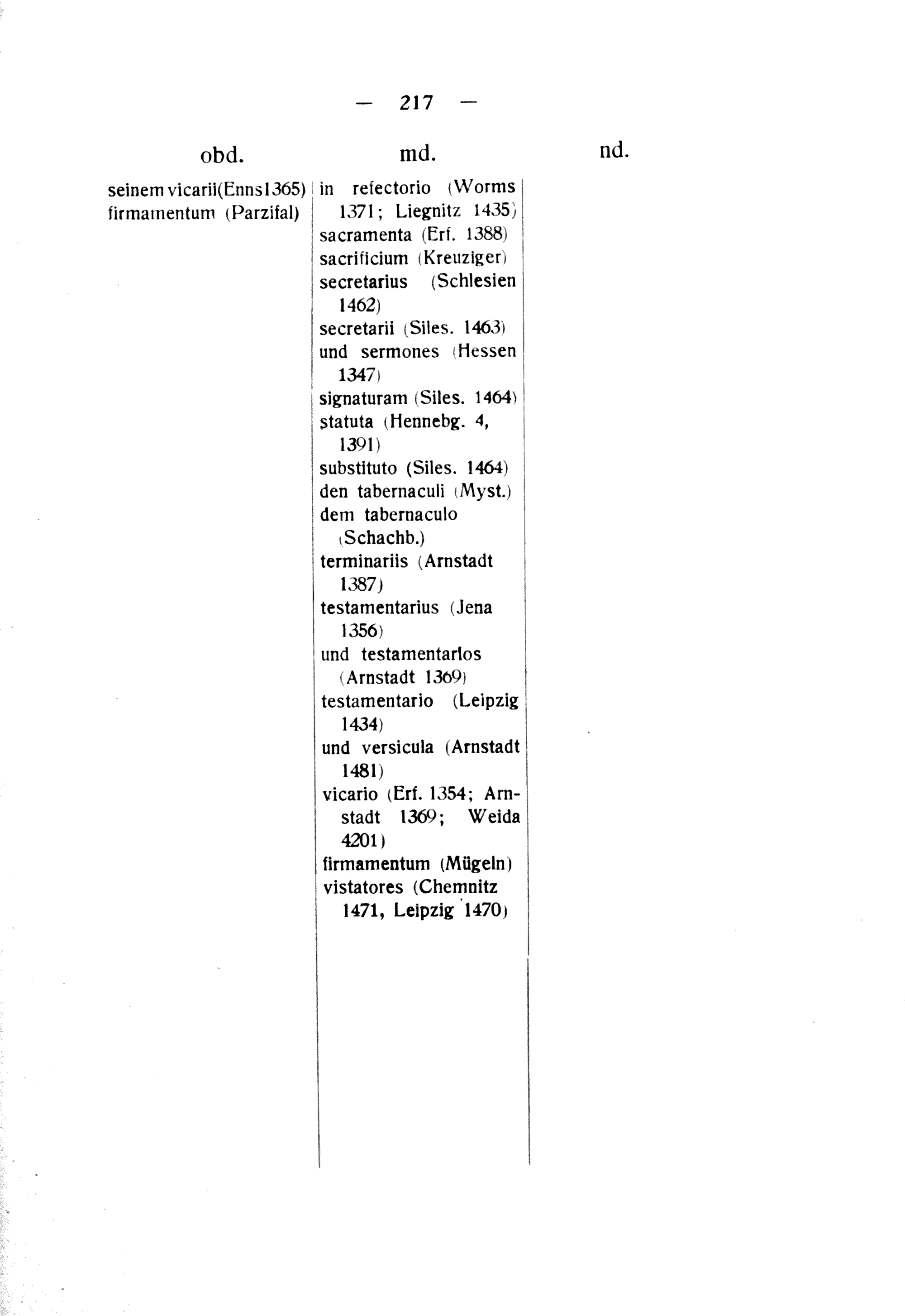 in refectorio(Worms 1371; Liegnitz 1435) sacramenta(Erf. 1388) sacrificium(Kreuziger) secretarius(Schlesien 1462) secretarii(Siles. 1463) und sermones(Hessen 1347) V signaturam(Siles. 1464) statuta(Hennebg. 4, V b V